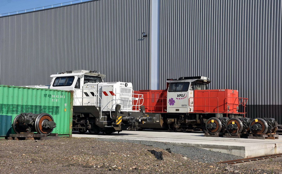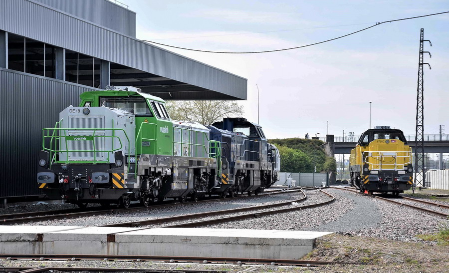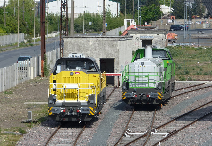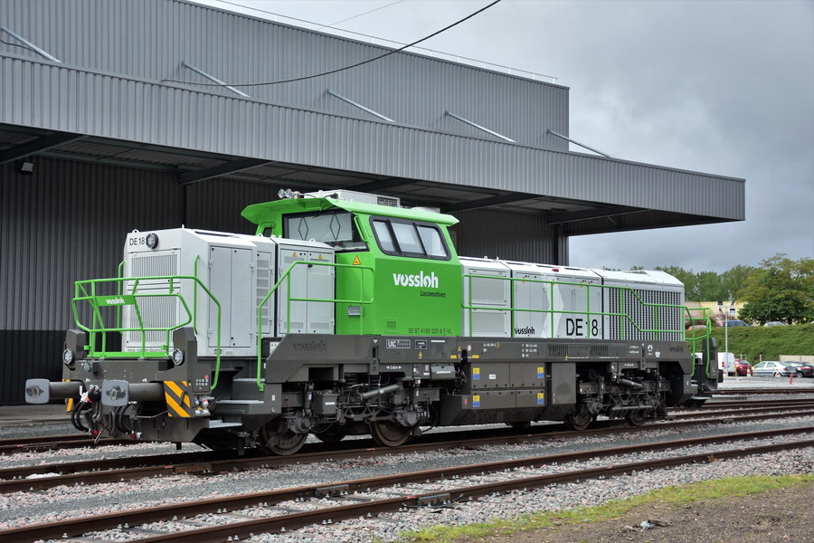 d'une nouvelle BB 79000 de SNCF RESEAU et d'une nouvelle DE 18 en livrée Vossloh en provenance de l'usine de Vossloh à Kiel en Allemagne