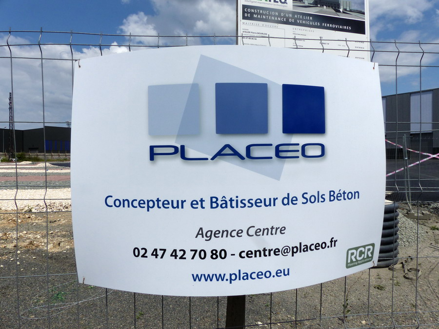 la pancarte de la société Placeo pour le sol en béton du nouveau atelier d'IMATEQ pour la maintenance des machines Vossloh à SPDC le 22-07-2018