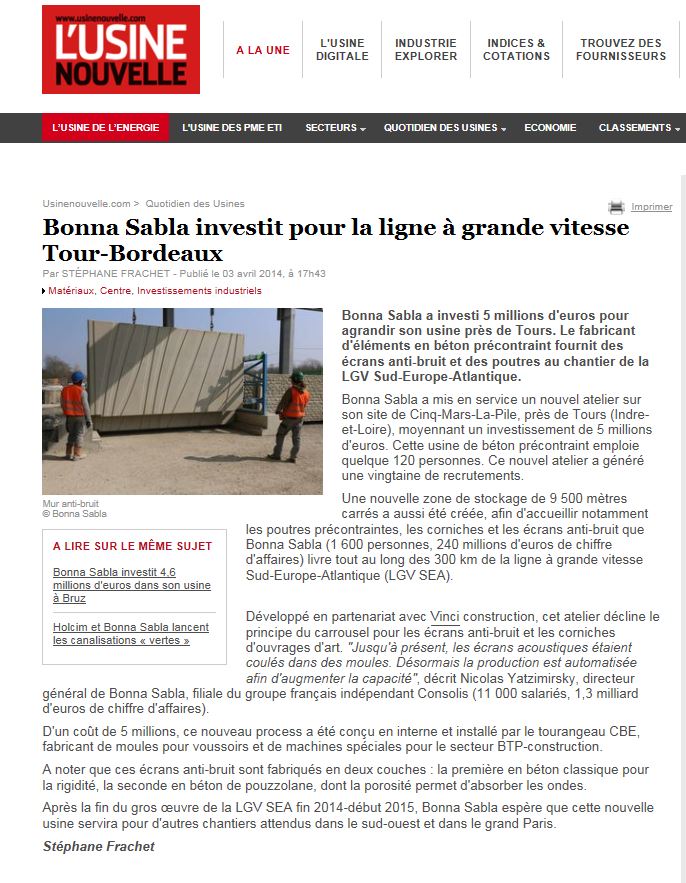 Voici un article de la Nouvelle République édition de Tours du mardi 04-11-2014 sur l'entreprise Bonna Sabla de béton