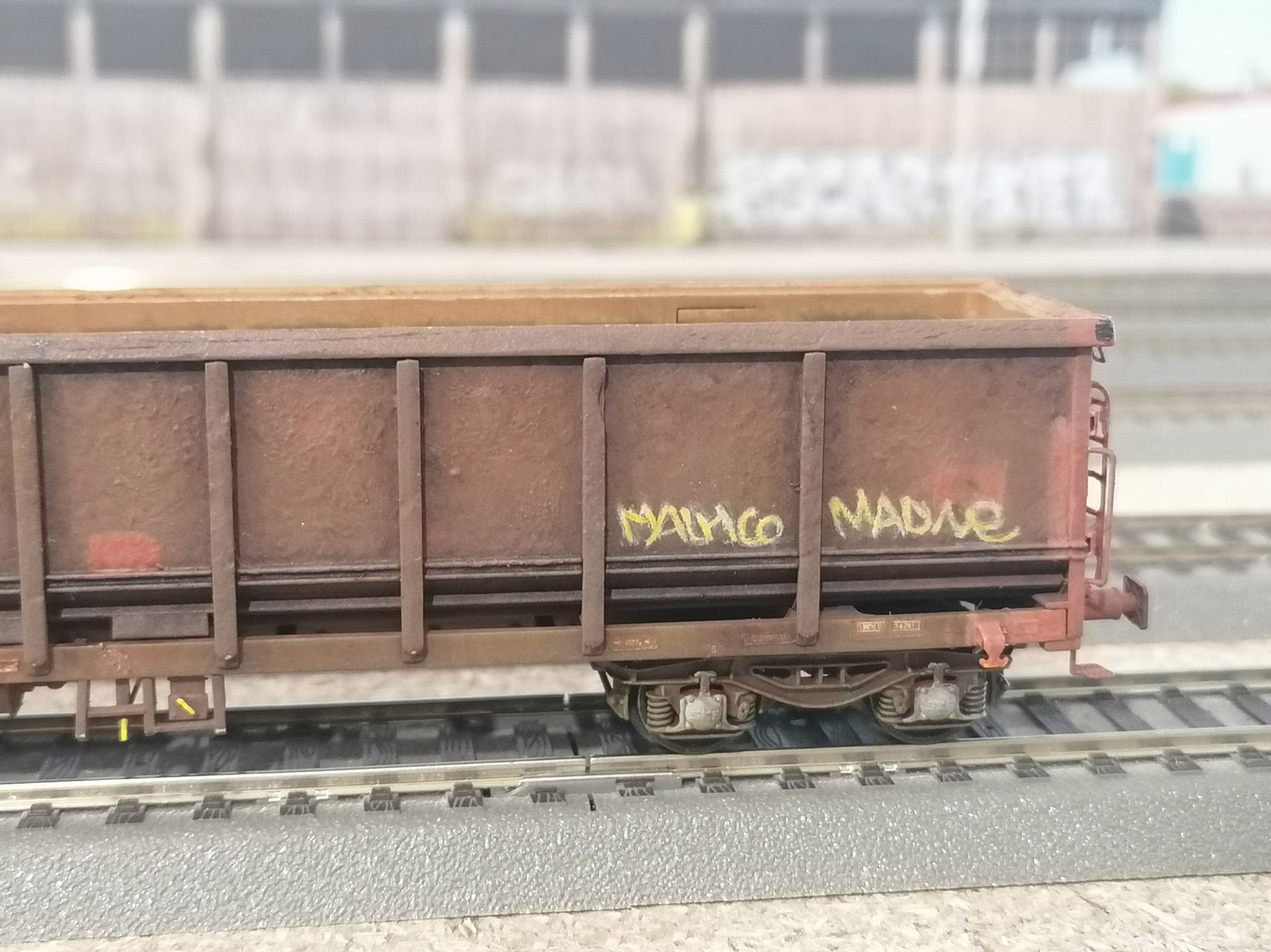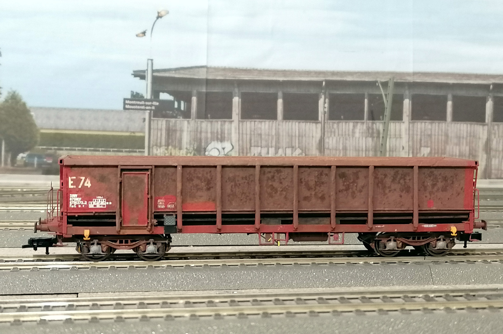 Les côtés du wagon tombereau E74 refait en platicard et avec des échelles SMD