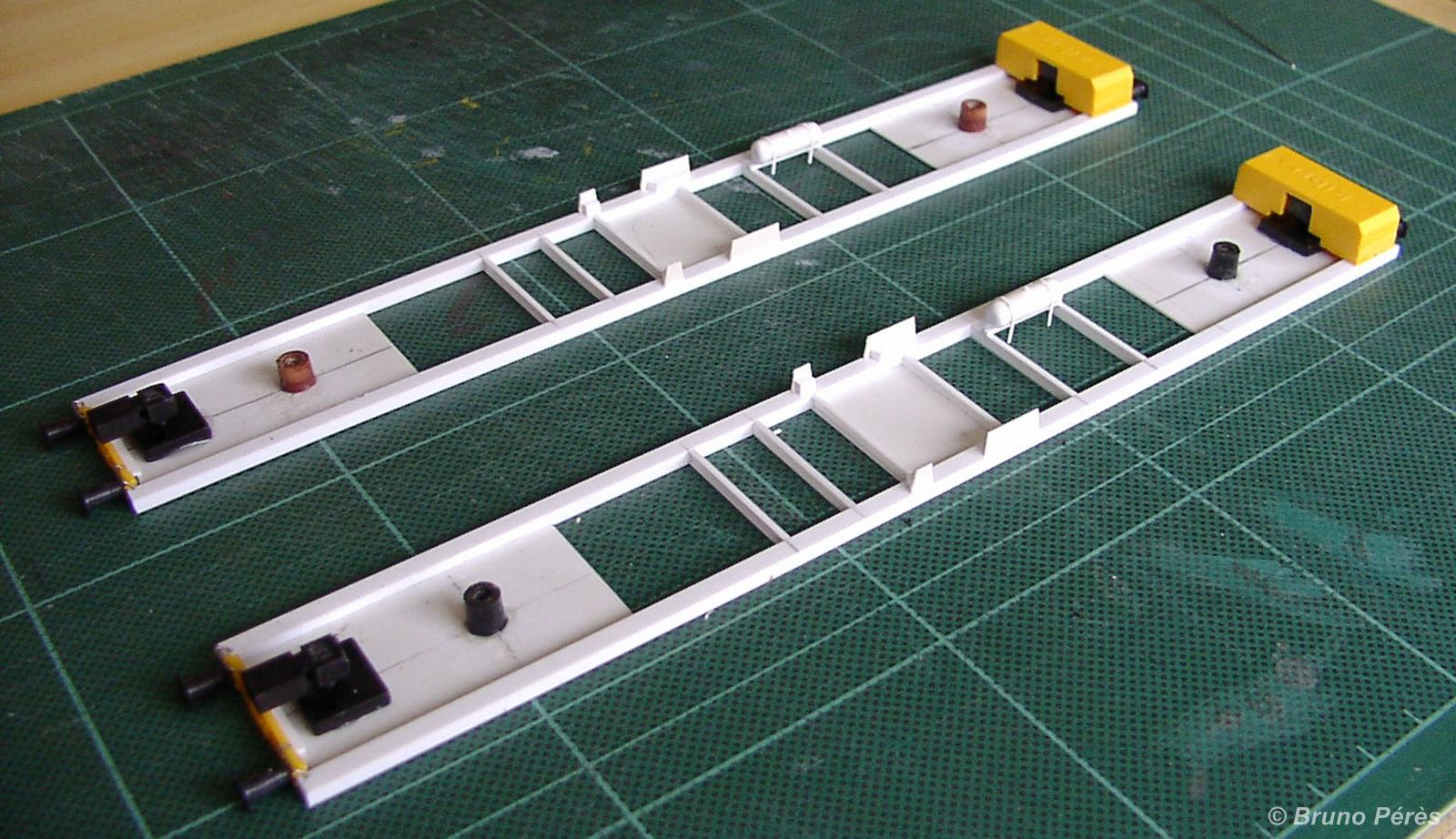 - contrairement à ce qui est dit dans l'article, les traverses Kibri sectionnées et poncées au ras des embases de tampons ne sont pas suffisamment longues. Il manque 1/2mm. Prévoir donc un poil plus long !