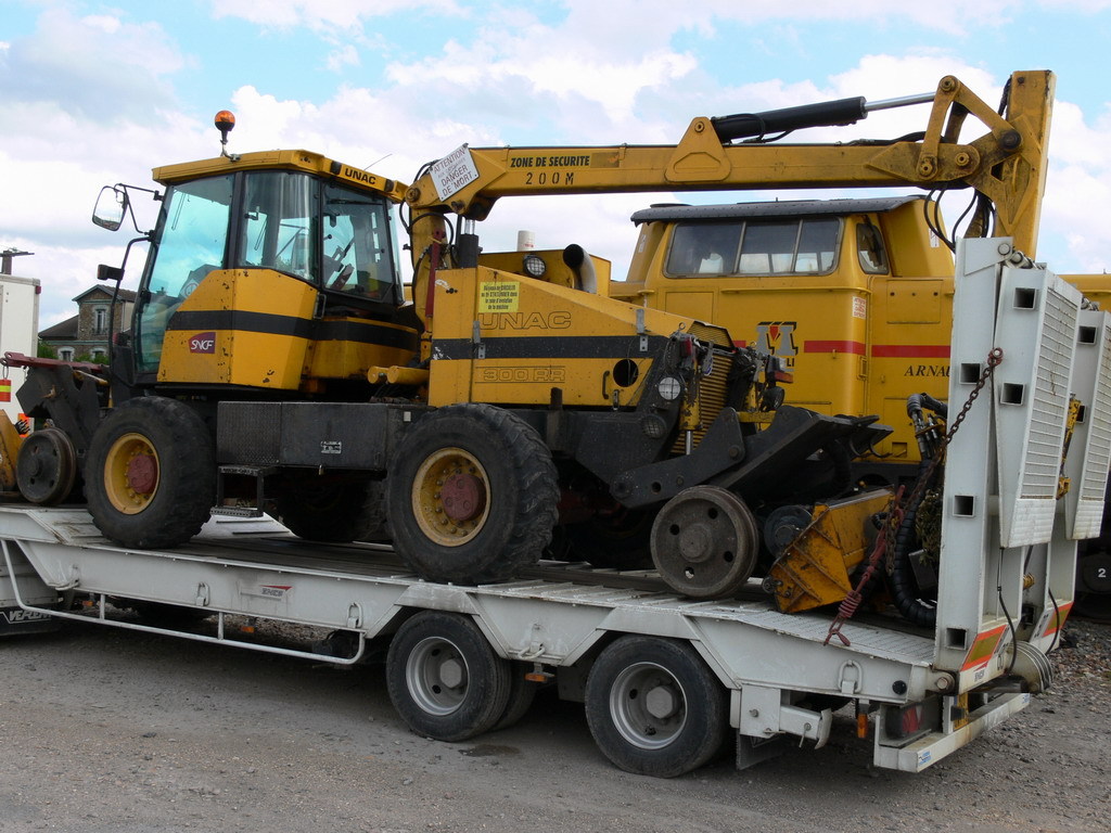 Voici une débrousailleuse rail-route UNAC 300RR, elle se trouve sur une remorque derrire un camion de la SNCF à Chateau-Thierry.