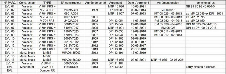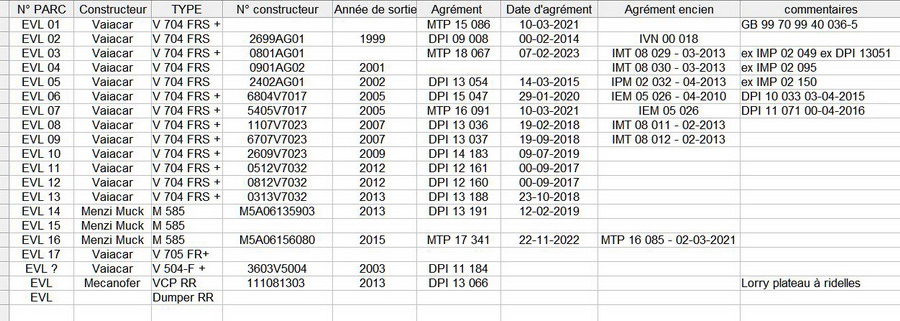 Voici une nouvelle mise à jour des engins d'EVL avec le rajout de la n°17 une V 704FRS+ mais pas de n° constructeur et d'Agrément de travail