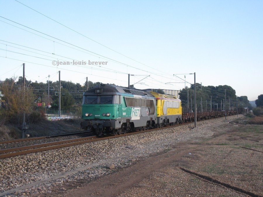 voici traversant La Crau _Var, l'UM de A1A A1A 68540 "verte" et 68537 "jaune" tractant un train Infra de Nice Saint Roch à Miramas _ 15 décembre 2009