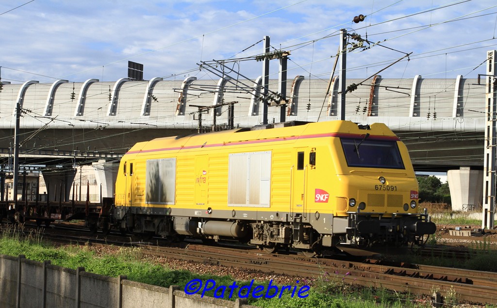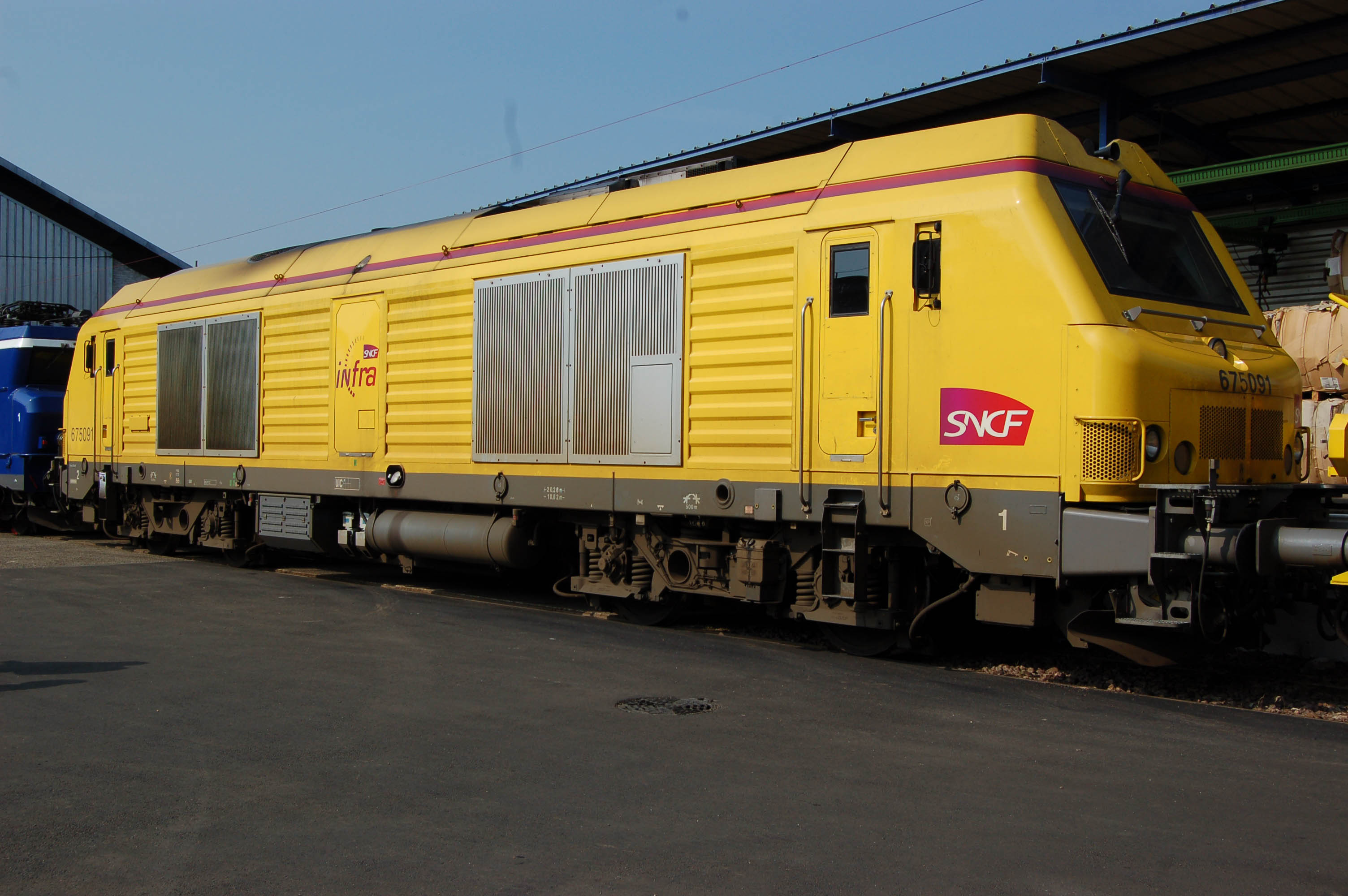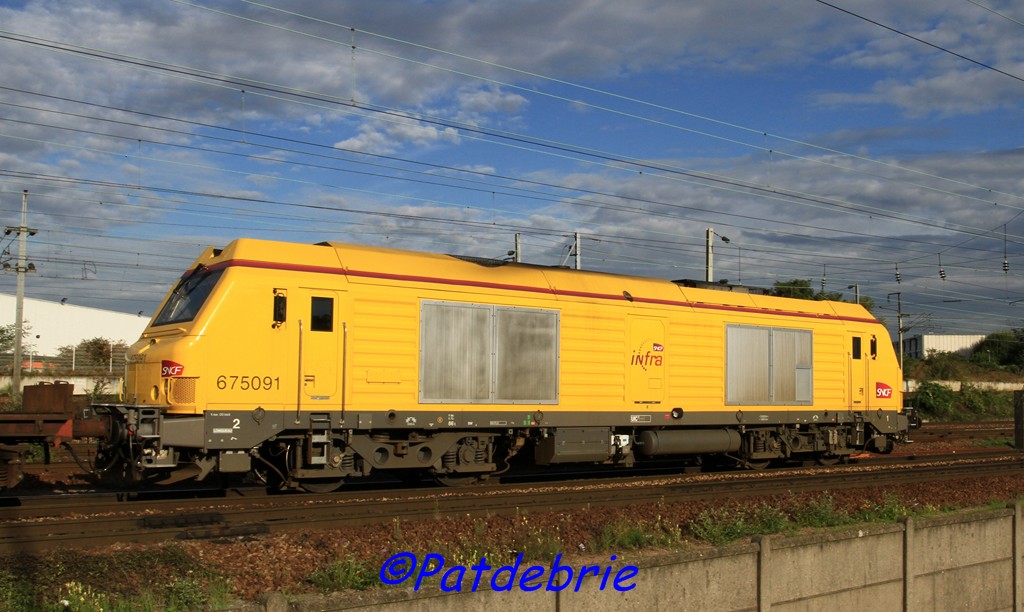 Voici la 675091 Infra en livrée jaune avec les 675080 Infra et 466126 avec logo Infra sur une rame de rails