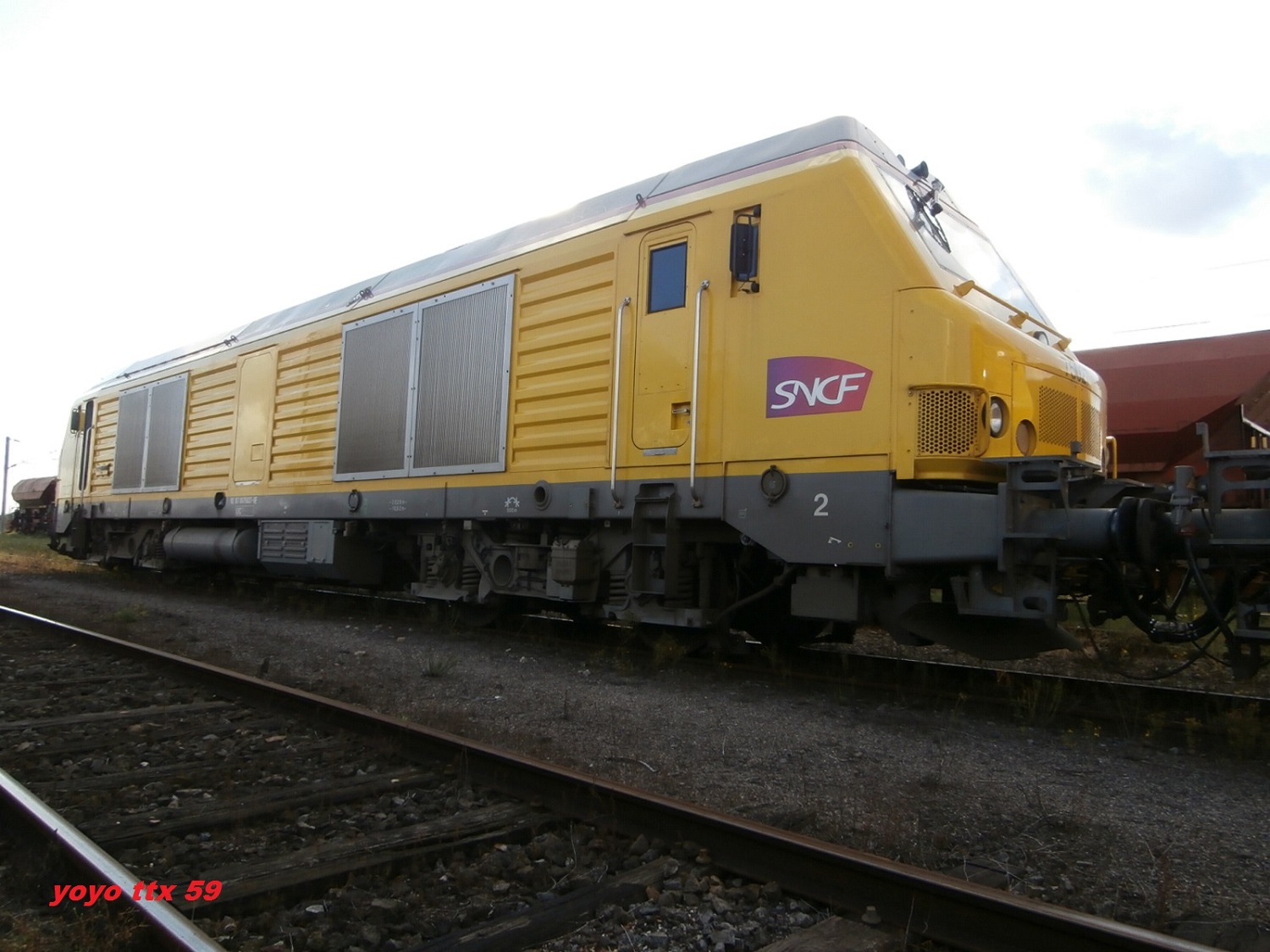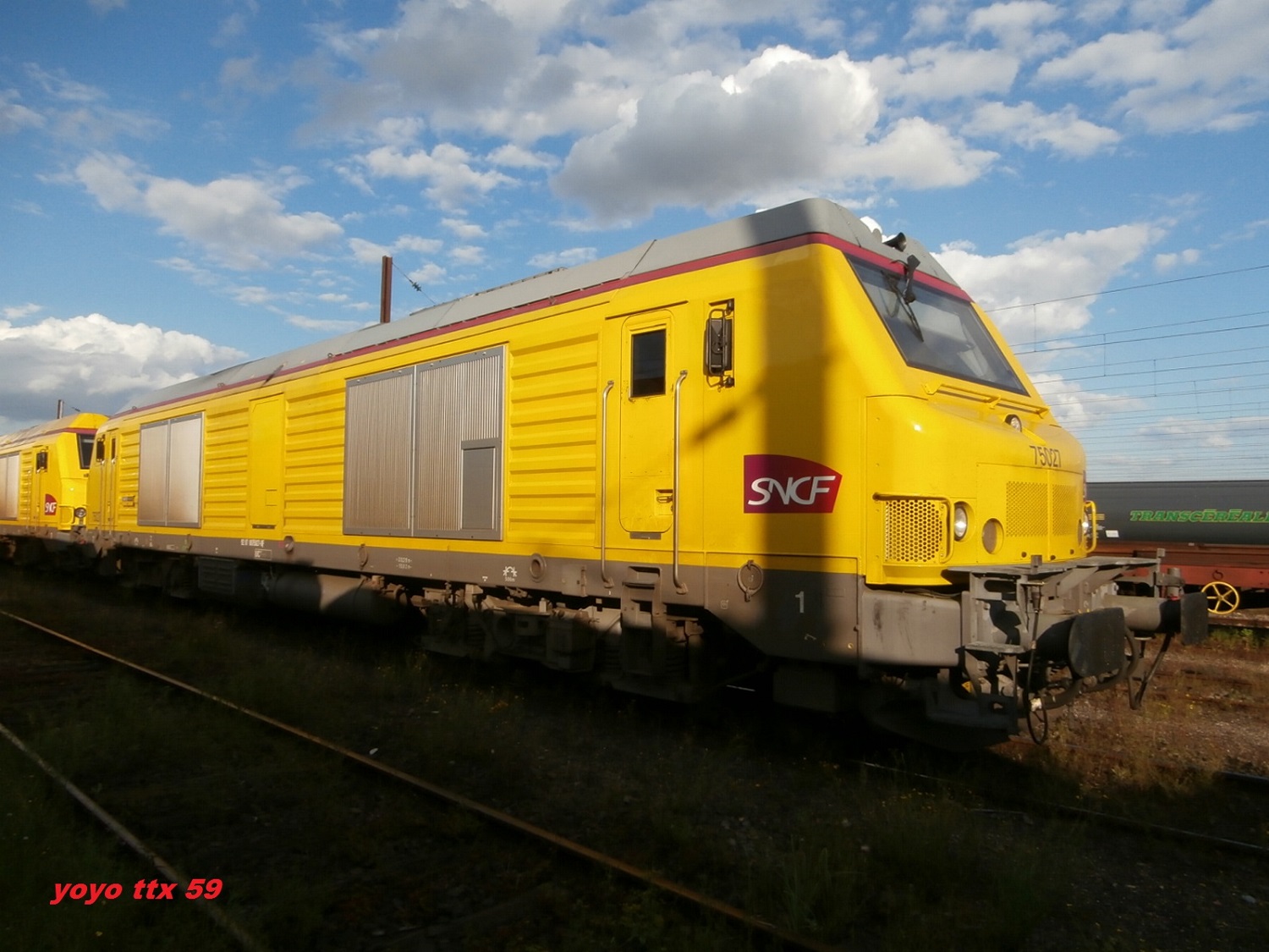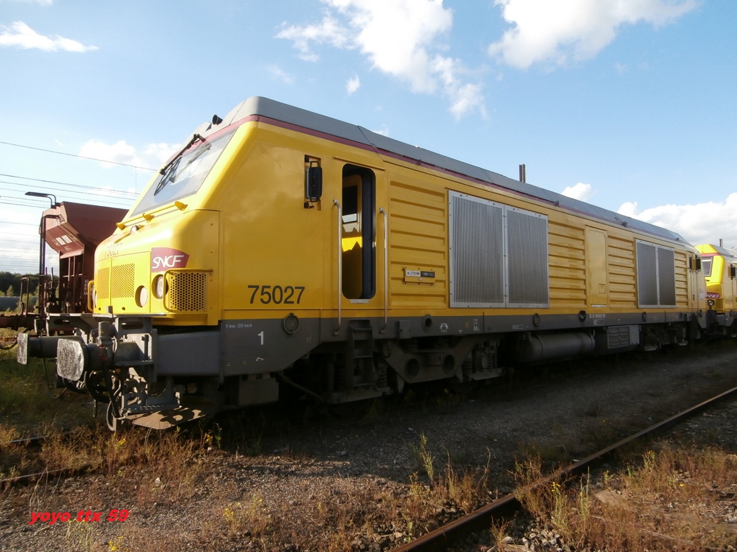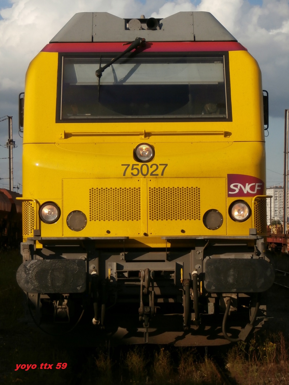 Vue hier au dépôt d'Achères, la BB 75027 vient de se voir appliquer une livrée jaune.