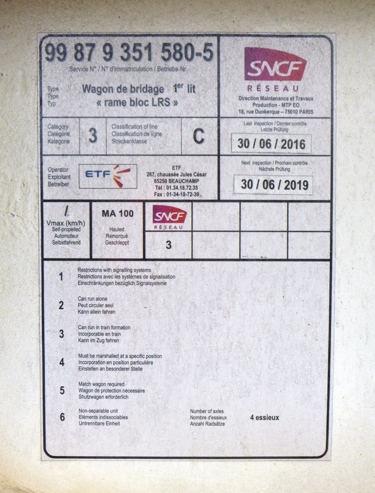 Wagon de bridage 1er lit de la "Rame bloc LRS ZD" ex 35 88 4 594 119-6 (B) date Agrément d'ETF 30-06-2016