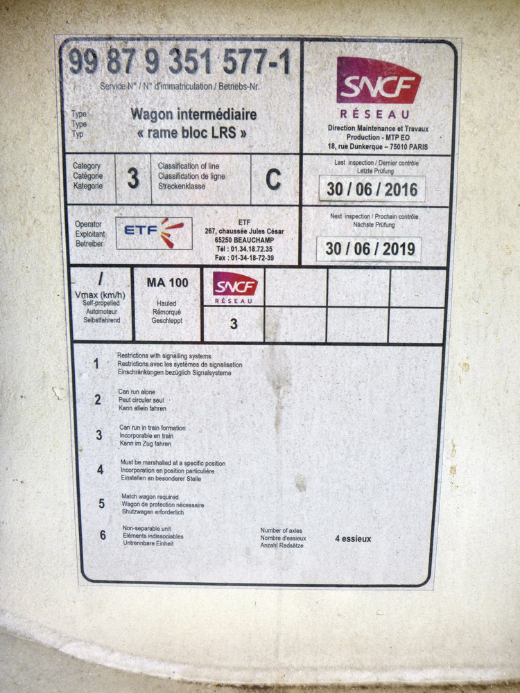 Wagon intermédiaire de la "Rame bloc LRS ZD" ex 33 88 4 594 219-4 (B) date Agrément d'ETF 30-06-2016