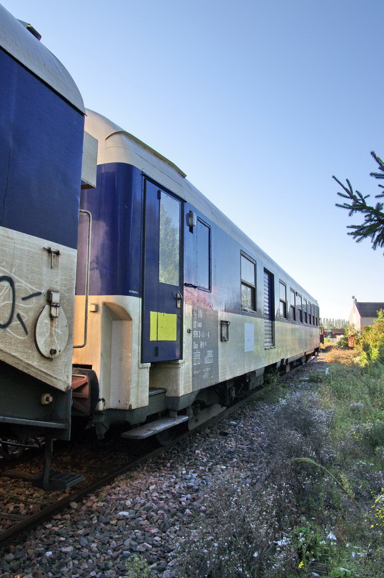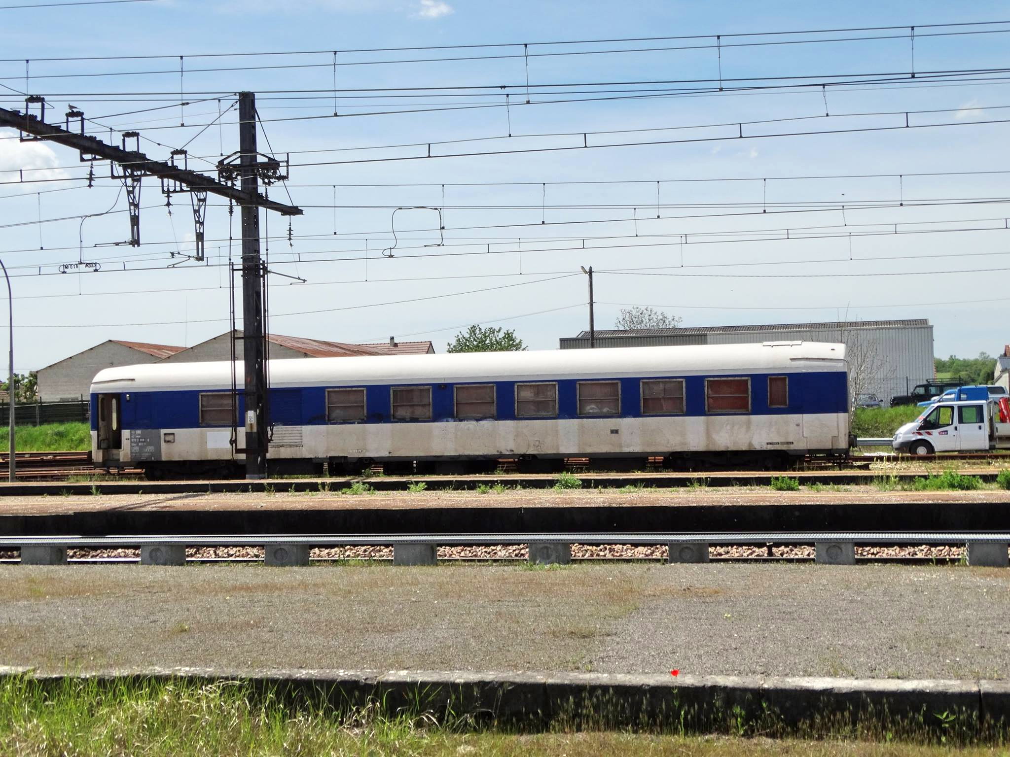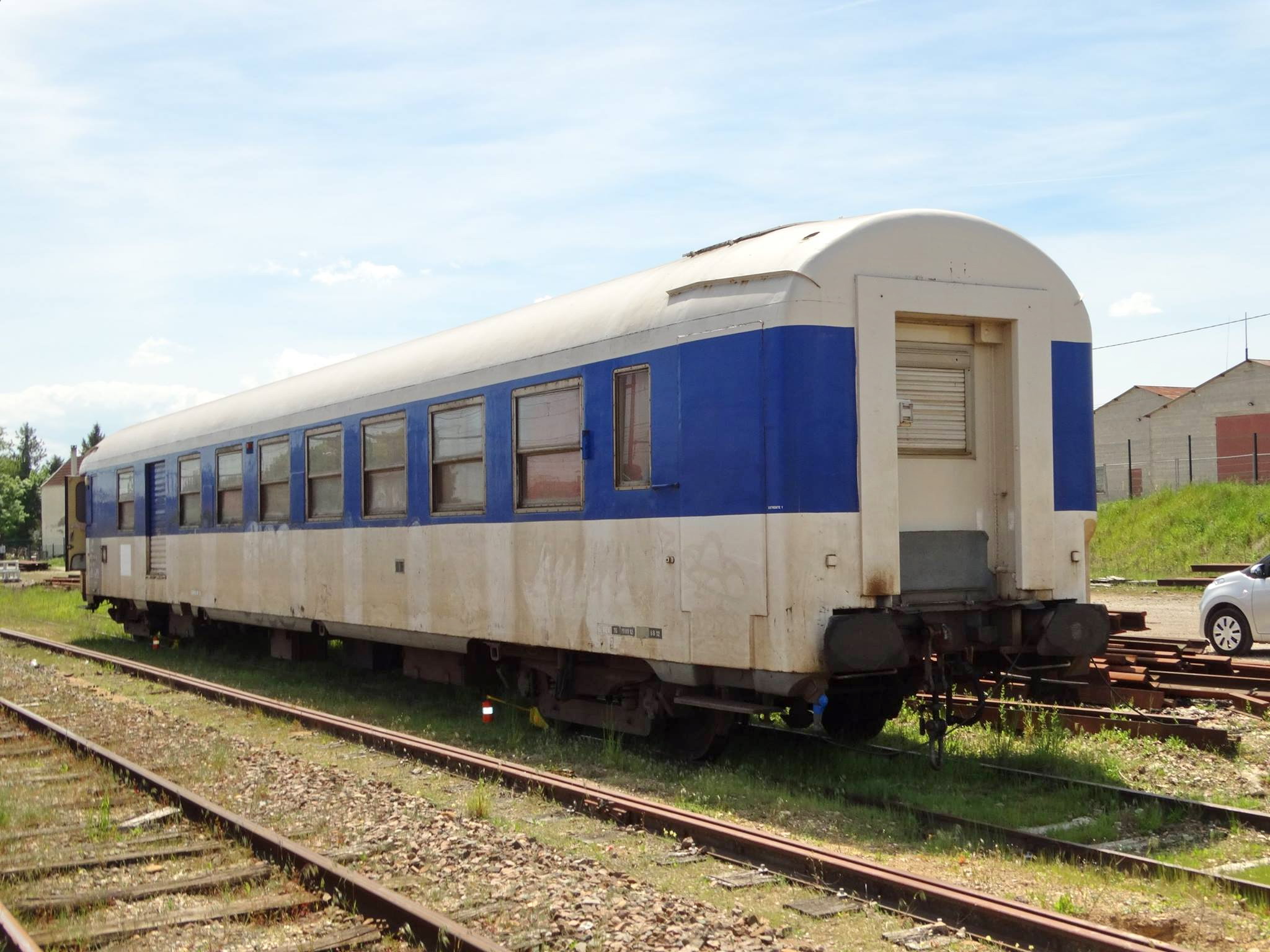 Voici la voiture de cantonnement 80 87 979 3 008-4 Uas H55 0 - F SNCF-MN (ex B5Dd2 UIC 50 87 82 70) avec le wagon de contôle