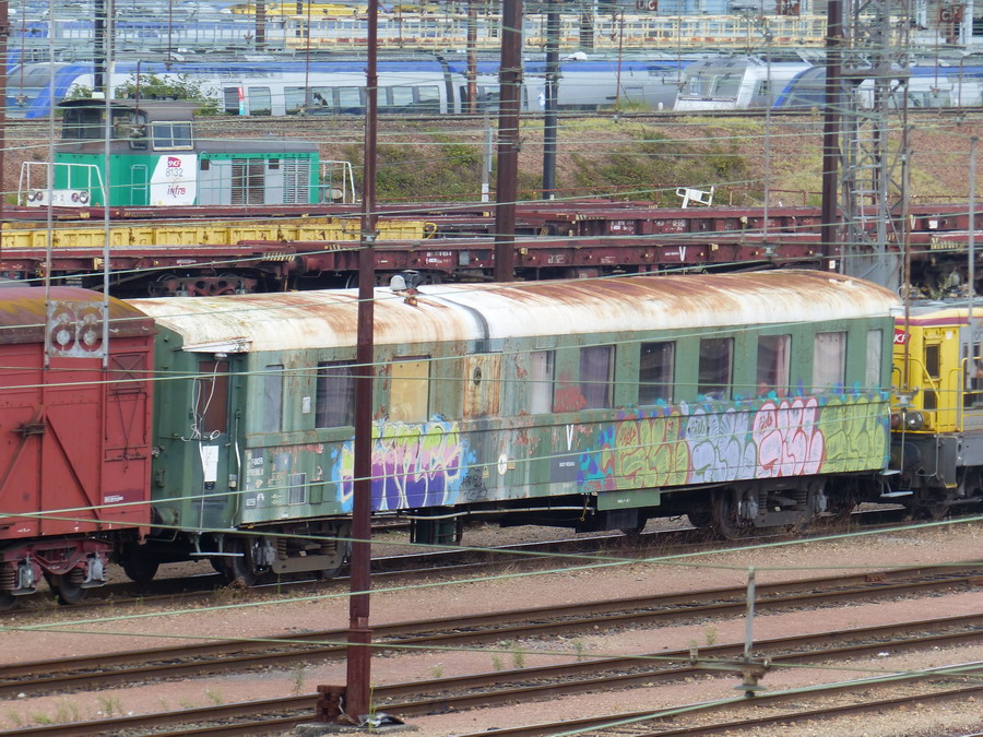 Voici la voiture 80 87 979 0 988-0 Uas H54 0 - SNCF-TR (ex A3B5 ?) Equipe de débroussaillement mécanique gare d'attache Saint pierre des Corps DV13 Bidon 5 avec son wagon qui l'accompagne 80 87 979 2 417-8 Uas H54 6 - F SNCF-TR