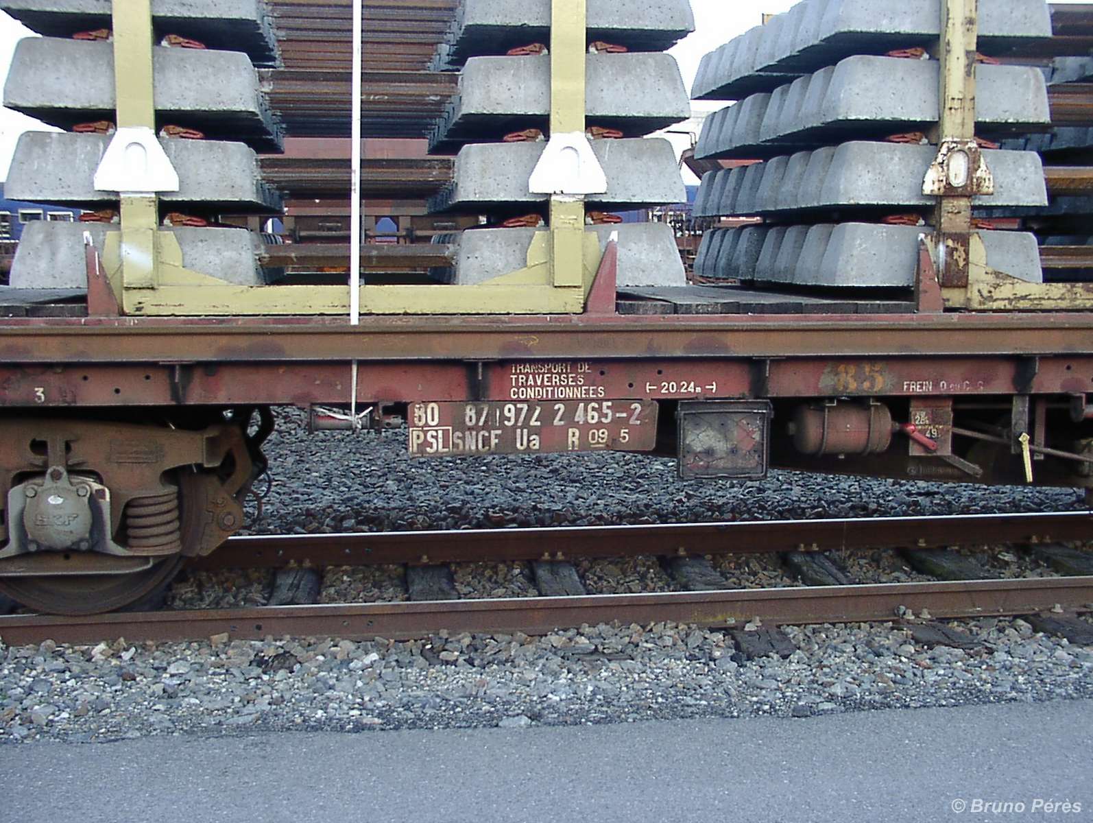 Voici quelques photos de plats chargés de traverses palettisées pour suites rapides. Ces palettes sont prises en charges sur chantier par des portiques circulant sur des rails fixés sur chaque flanc des wagons. Ces portiques alimentent le train de substitution SMD 80 (ETF ou Colas Rail), la TSV 21 GP (TSO et Colas Rail) ou le futur P95 d'ETF.