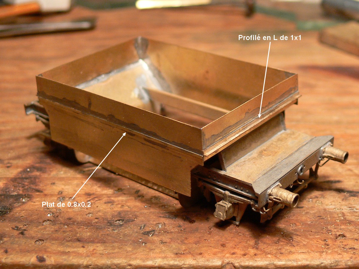 On prend les bords d'une plaque de photogravure d'un kit terminé bien d’équerre (à garder précieusement), d'une largeur de 1.5 mm pour faire le bord haut de la benne et on soude :