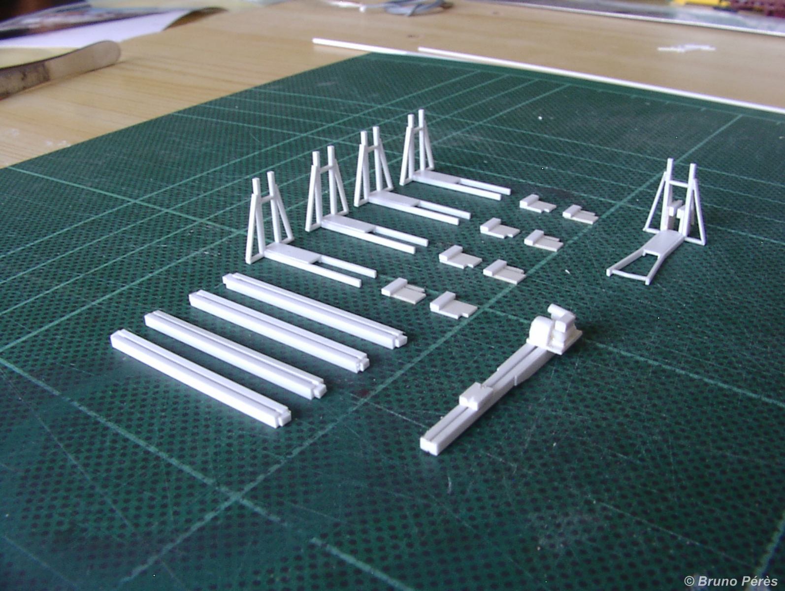Les travaux d'hier soir ! Finalement, j'ai pris la décision de ne pas changer grand chose par rapport au proto en dehors de la façon de monter les pièces, histoire de me faciliter la tâche. En effet,je voulais biseauter certaines pièces obliques pour qu'elles se collent au mieux aux pièces verticales, mais difficile de le faire facilement et correctement quand ces montants obliques ont une section de 0,5mm ! A suivre ...