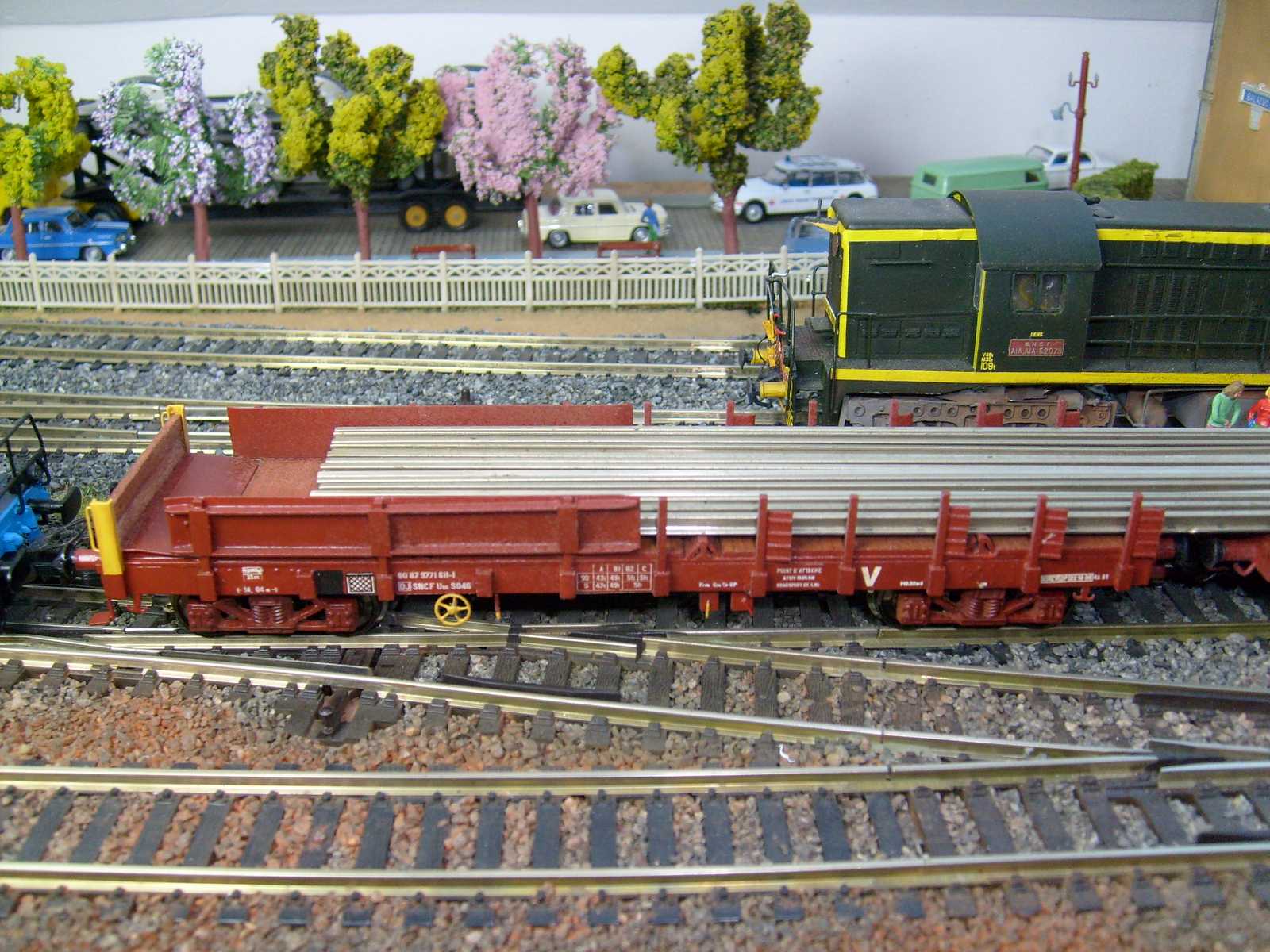 c'est la solution que j'ai choisi pour mes deux futures rames de transport LRS... Une chargée mais qui restera stationnée sur une voie de garage... Et une rame qui roulera mais vide, je pense comme Bruno que faire circuler une telle rame chargée est quasi impossible, à moins peut être d'avoir un réseau au tracé rectiligne et des aiguilles en proto 87... Ou alors des courbes de "X" mètres de rayon!!!!!!!!