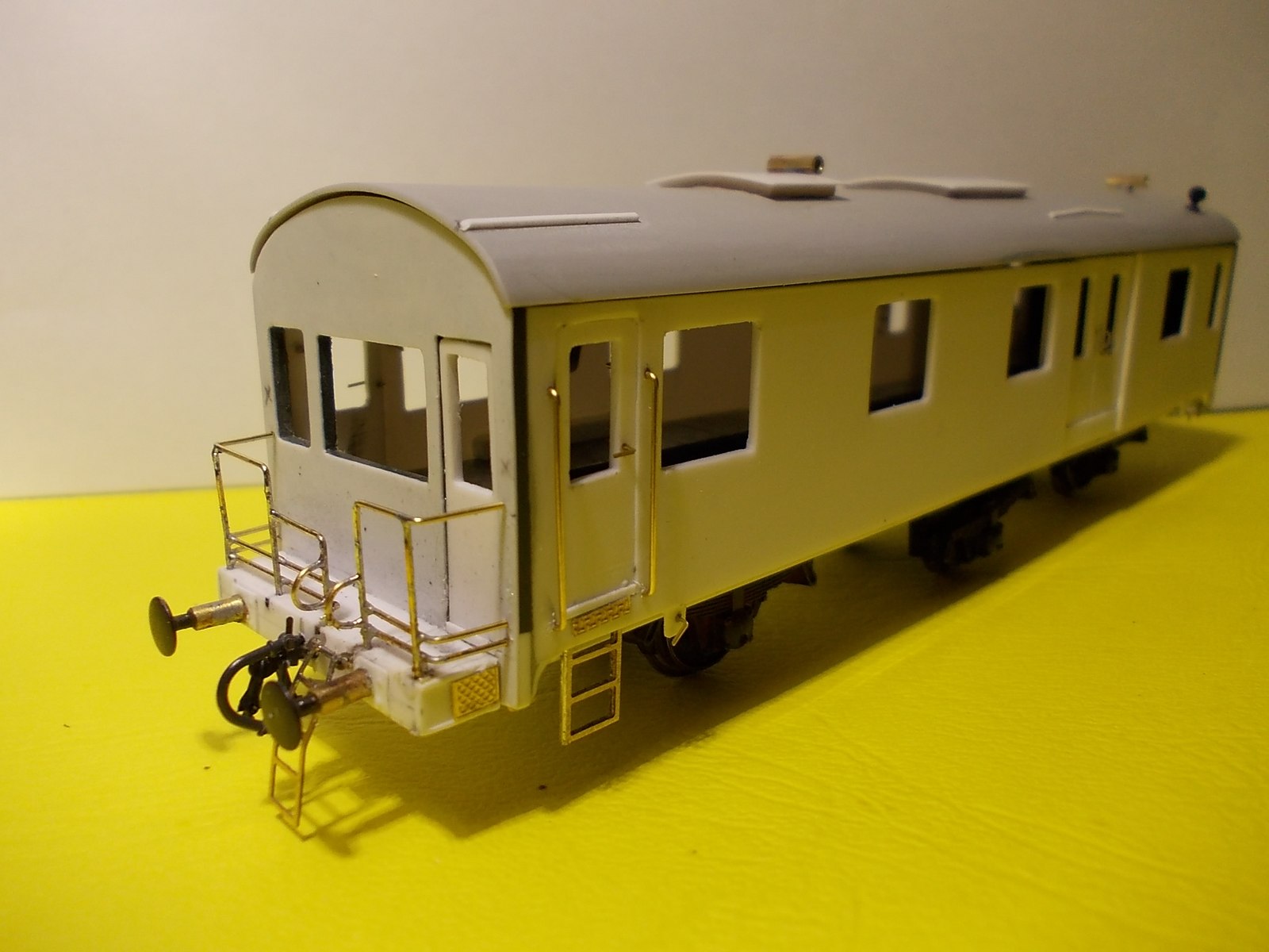 La base utilisée,enfin ce qu'il en reste est une "trois pattes" Fleishmann,une partie de la caisse bien réduite,la toiture et les organes de roulement.