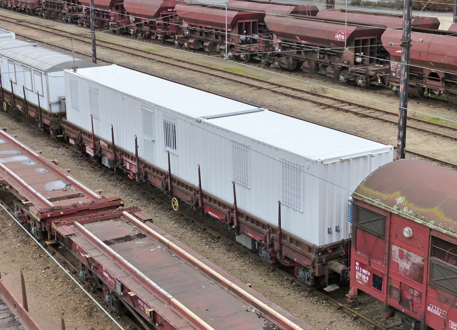 - 80 87 979 4 738-5 Uas R55 6 F SNCF-NT (wagon plat à bogies avec bungalow)