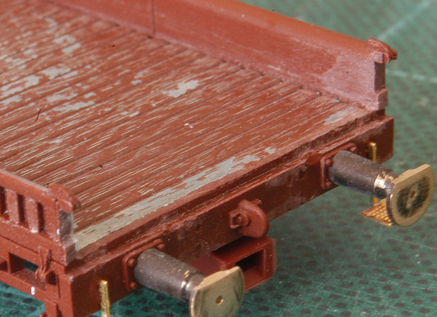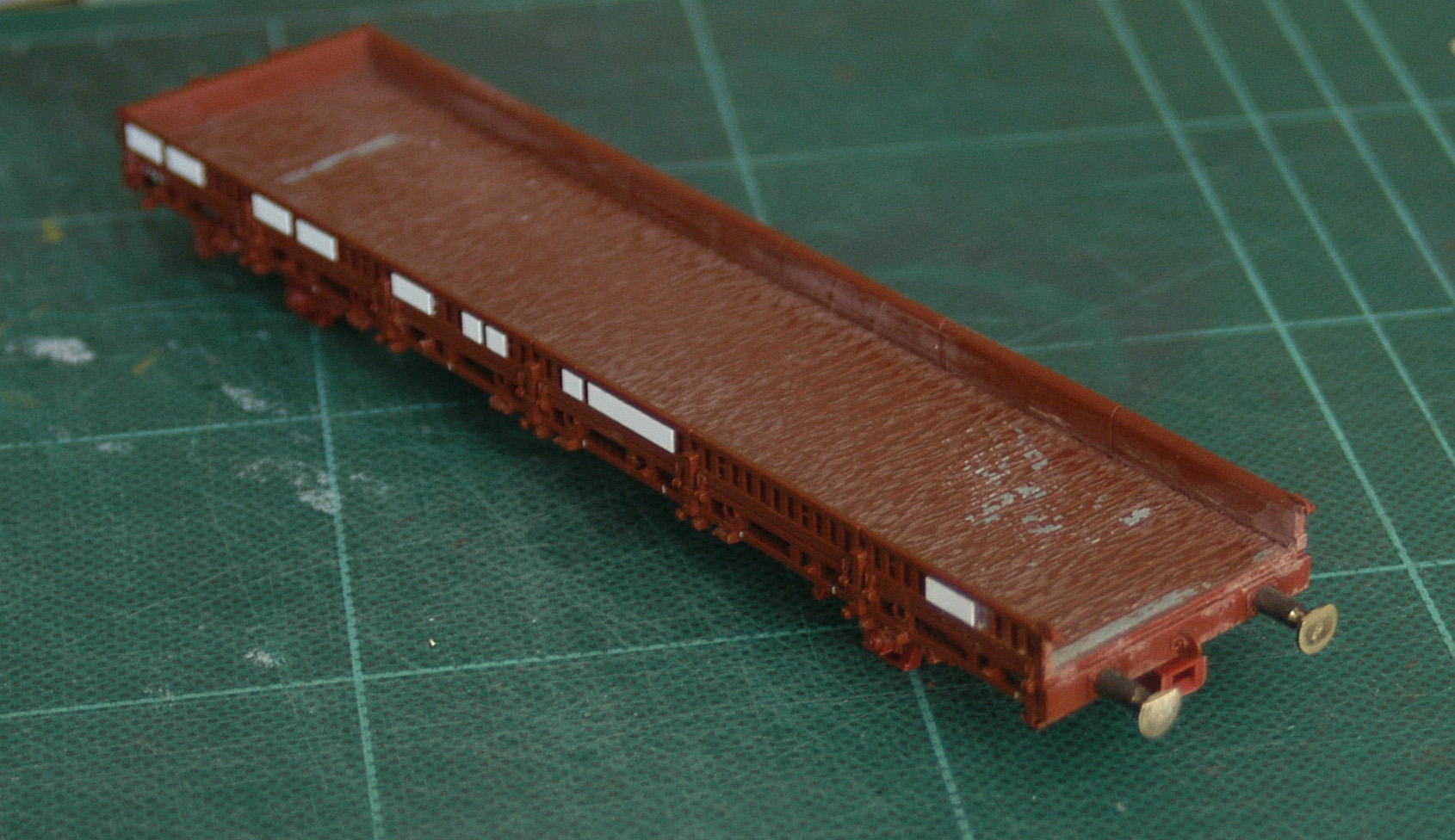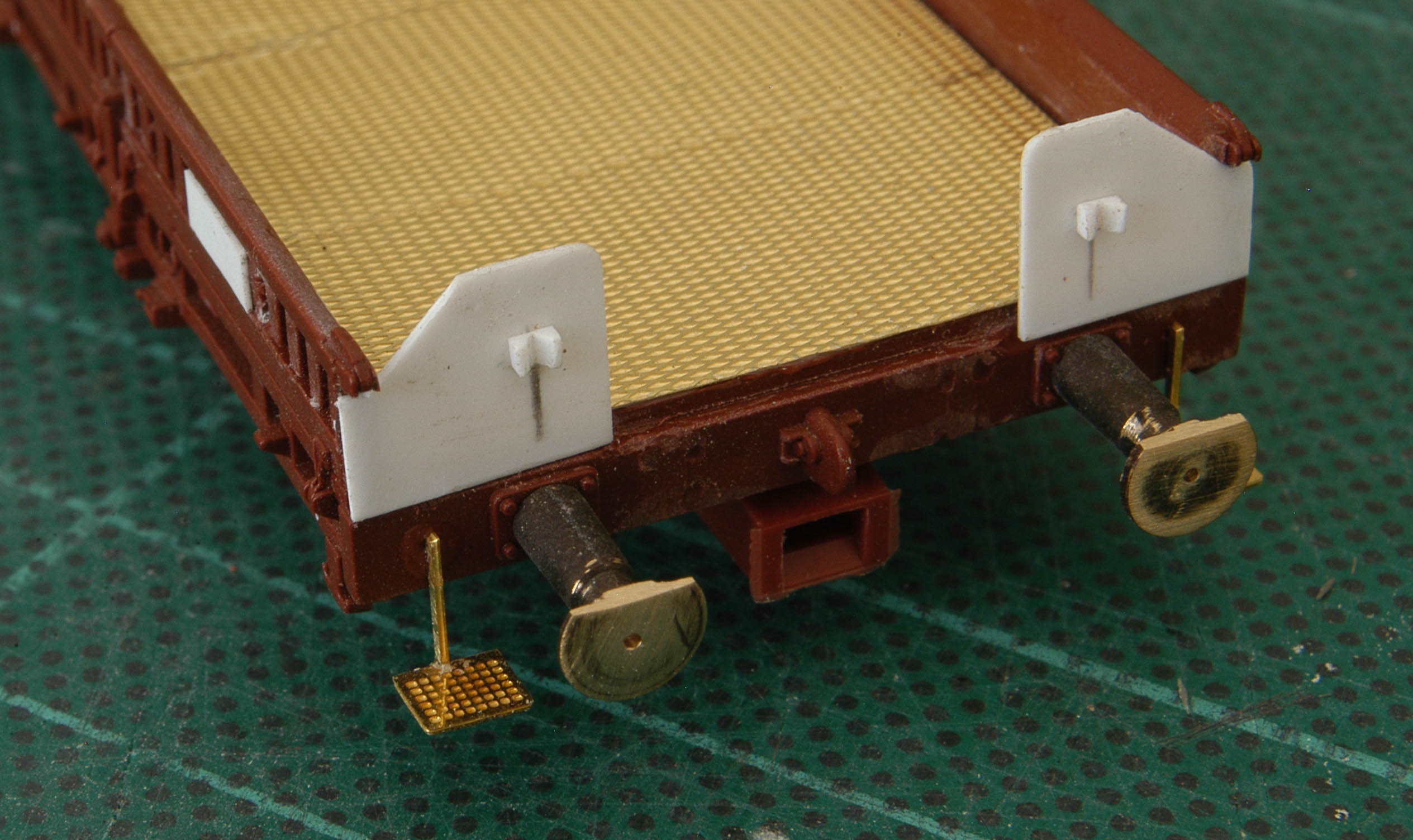 Poncer le dessus des tampons côté ridelle supprimée, puis réaliser les nouvelles ridelles en carte plastique. Ces ridelles se rabattent (en réalité seulement :roll: ) sur les tampons et sont raccordées à une rampe démontable qui permet de monter ou descendre la caleuse sans pour autant avoir besoin d'une quelconque grue.