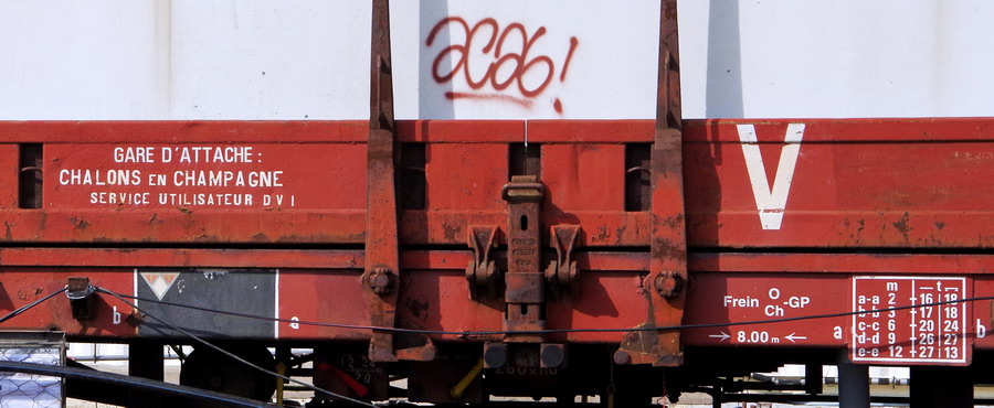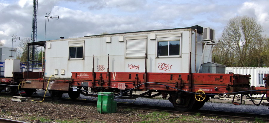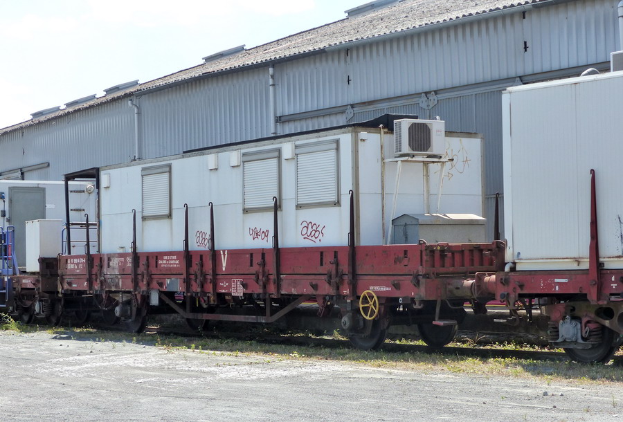 Voici le wagon plat 40 87 959 4 470-6 Us K55 1 SNCF-RS - gare d'attache Châlons-en-Champagne