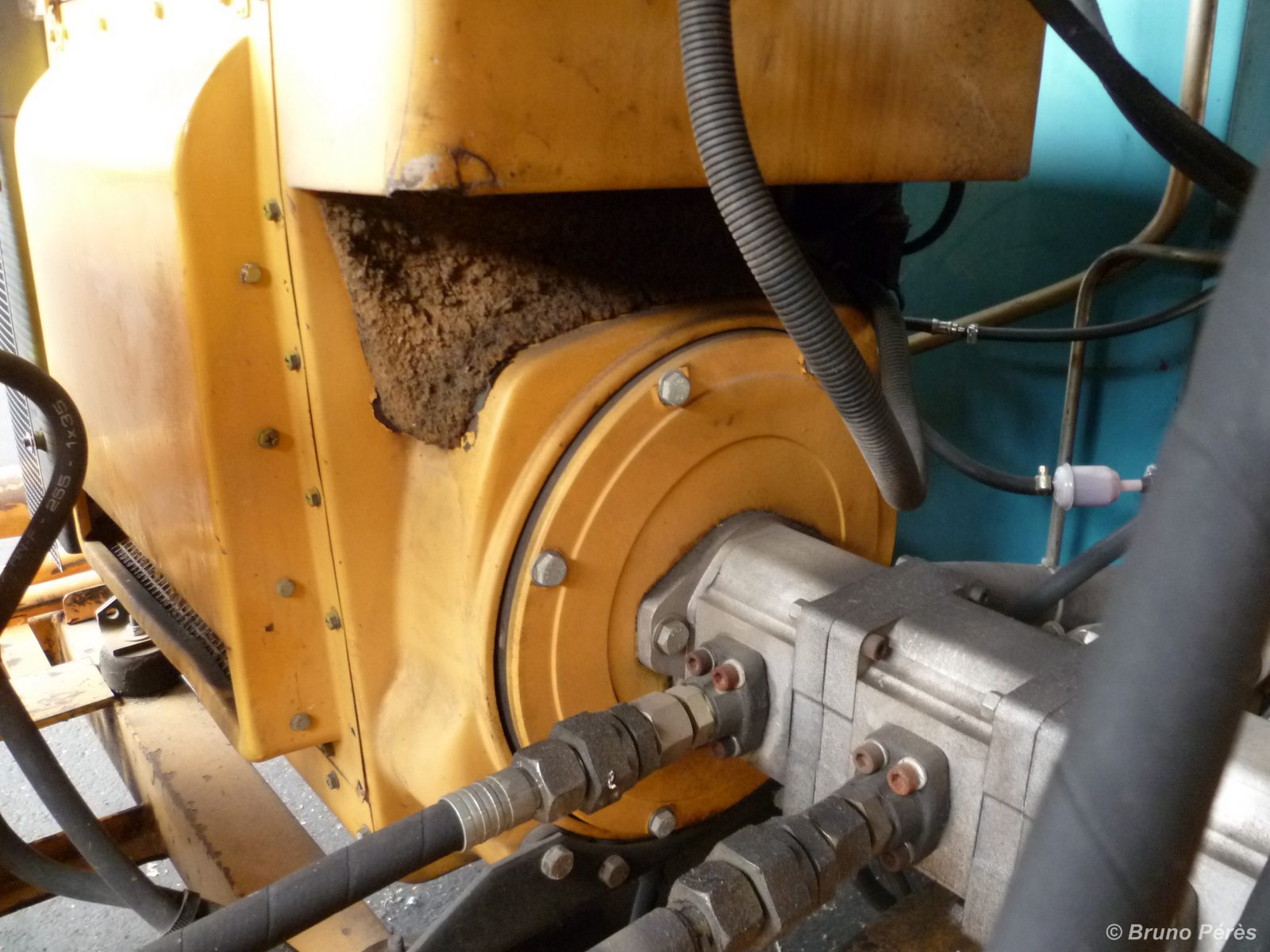 Moteur en jaune, pompe hydraulique triple en gris vus sur une caleuse BR1T SR Geismar