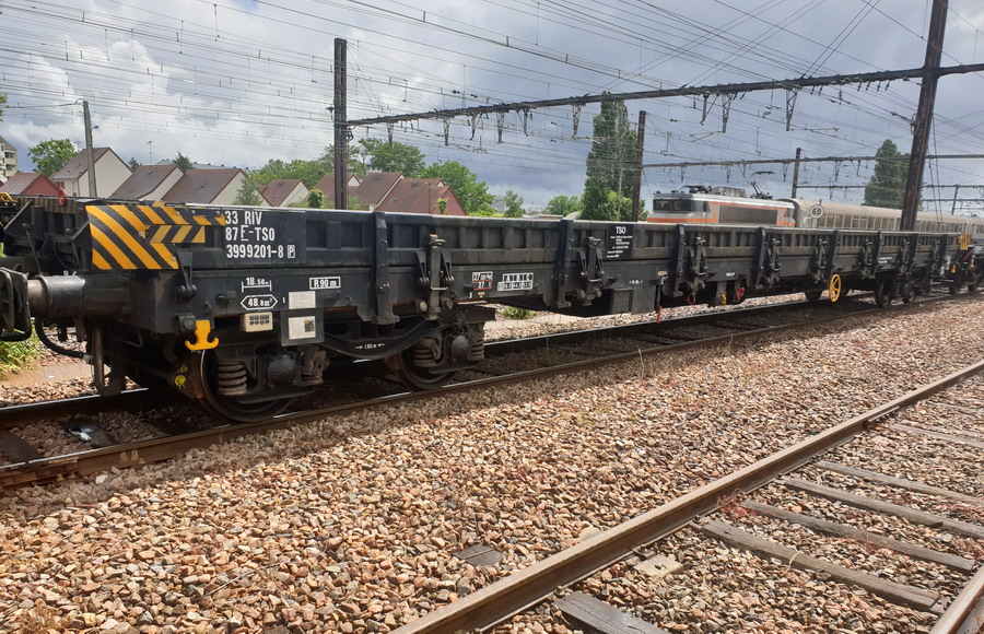 Wagon plat 33 87 3999 201-8 RIV F-TSO de 19,90 m et d'une Tare de 27,22 T il se trouve sur la rame béton de TSO triage des Aubrais-Orléans pour Nangis (électrification de la ligne Paris Troyes) le 12 juin 2019