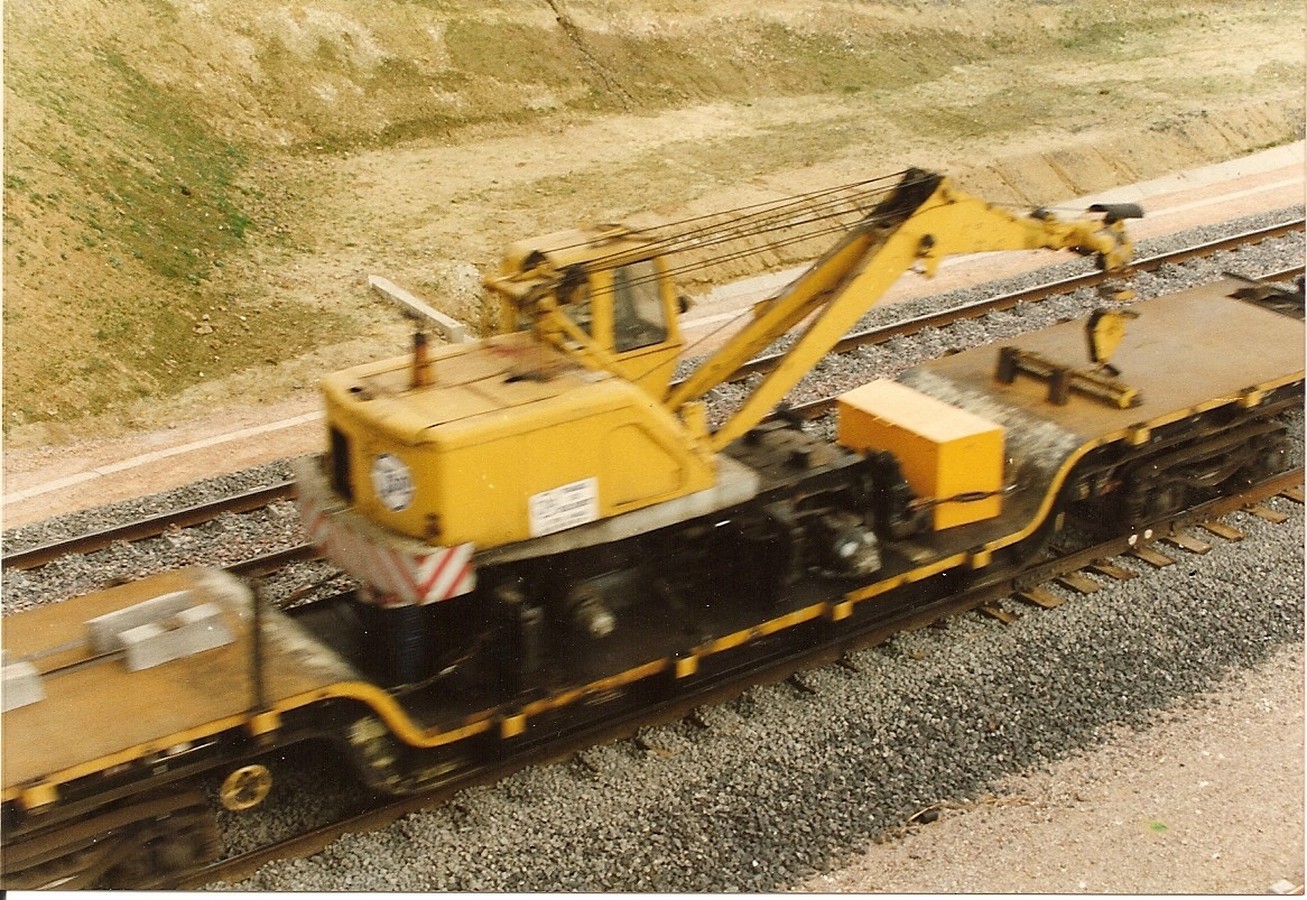 Voici donc la suite du convoi tracté par le loco CFD TSO: deux surbaissés chargés de grues et un K 50 chargé d'une pelle POCLAIN