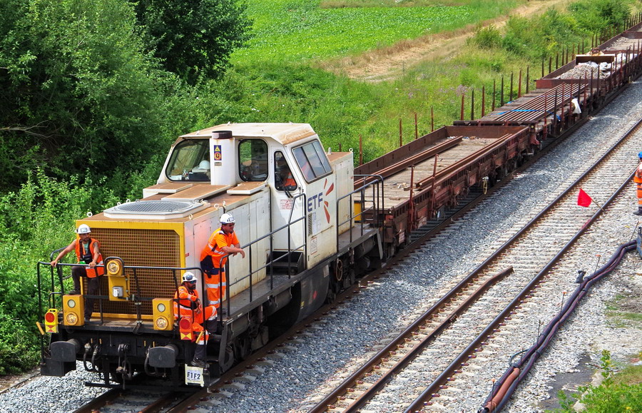 Photo de Gtr Lefèvre le 12 juin 2018 au niveau du pont de Bray à Jussy (02) de retour du RVB pour la basse de travaux de Laon avec le train n°F1F2 rame de finition et de ramassage de fin de chantier