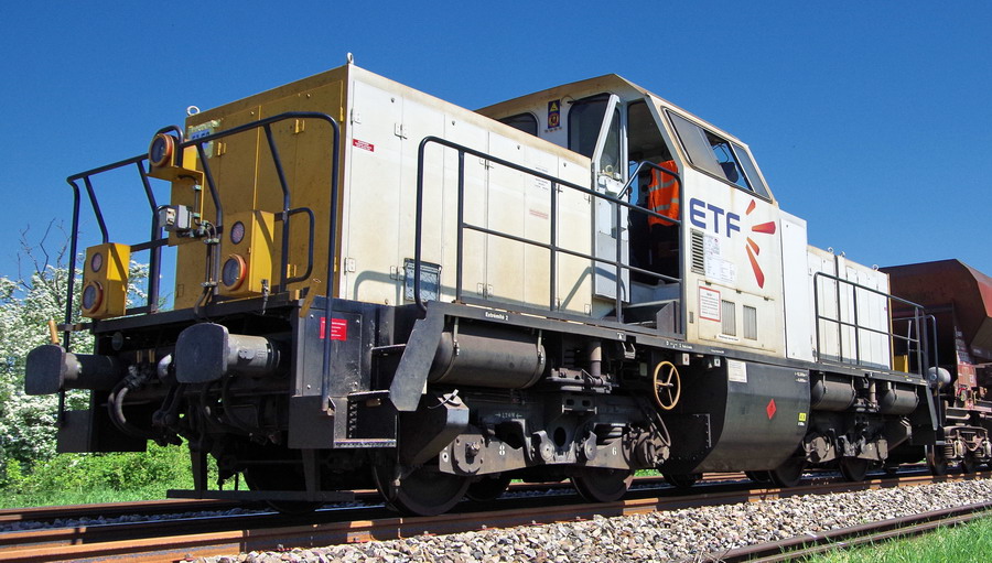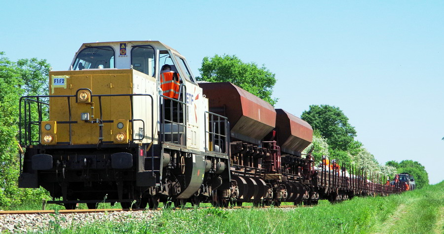 La voici entre la gare de Jussy et les ponts de Bray (02) sur une rame de TTX pour la finition sur le RVB Amiens Laon