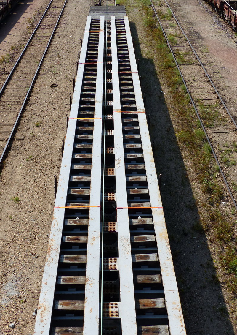 Voici le wagon 33 87 3902 858-1 Rs R80 2 RIV F-ERSA à Saint Pierre des Corps le 09-09-2014 avec un tablier de pont (+ compo)