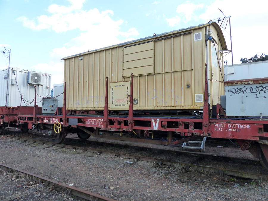 Voici le wagon plat à essieux 40 87 954 3 302-3 Us Type K 54 6 - F SNCF-LM - Point d'attache ELRE Limoges avec bungalow
