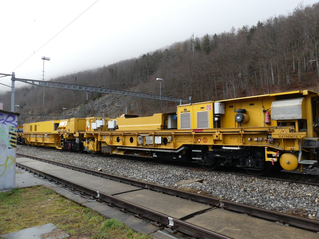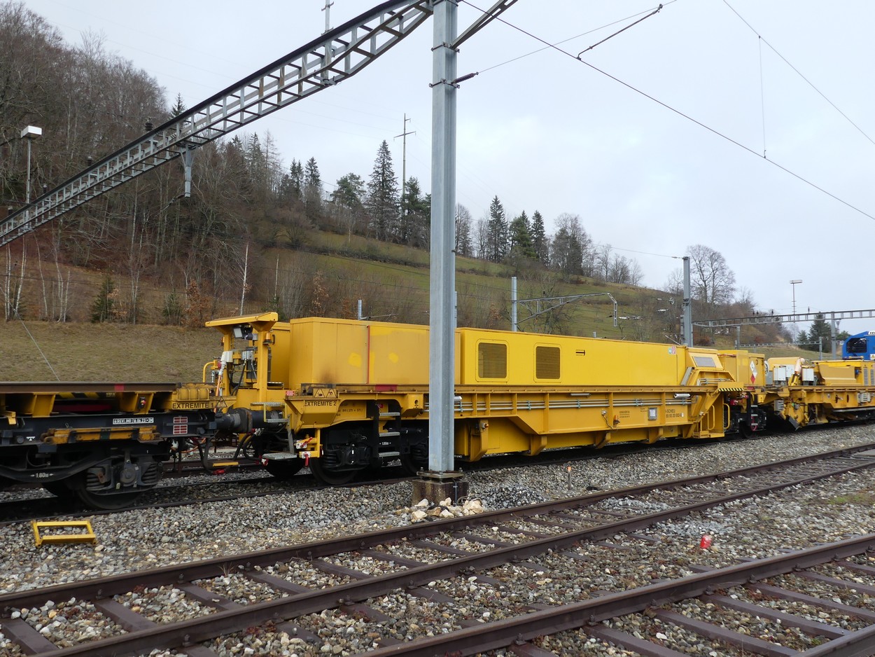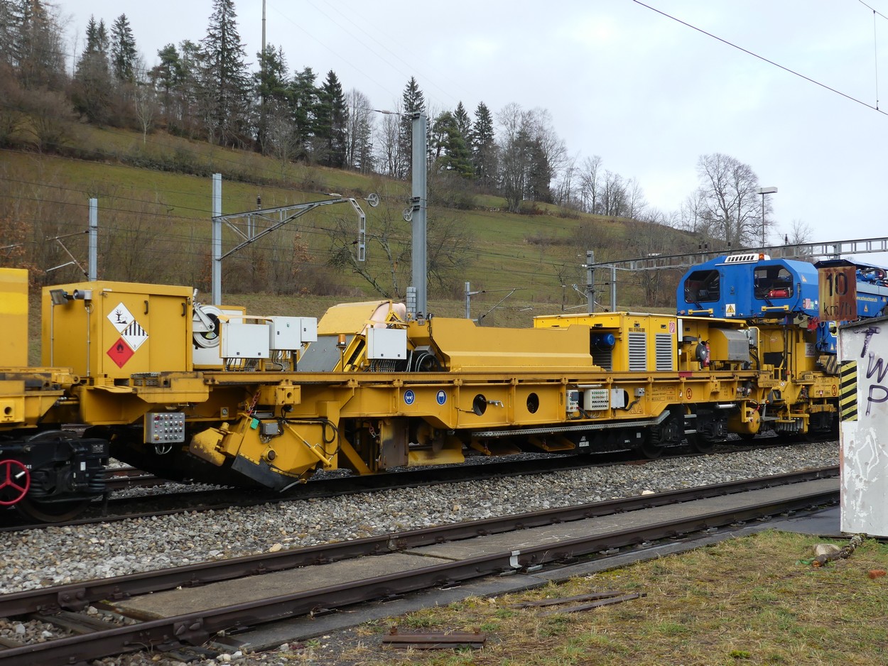 Voici un wagon que j'ai pris en photos à Vallorbe. Je penses qu'il accompagne le Puscal S. Il porte une brosse ainsi qu'un silo de stockage du ballast et des trappes pour le déversement.