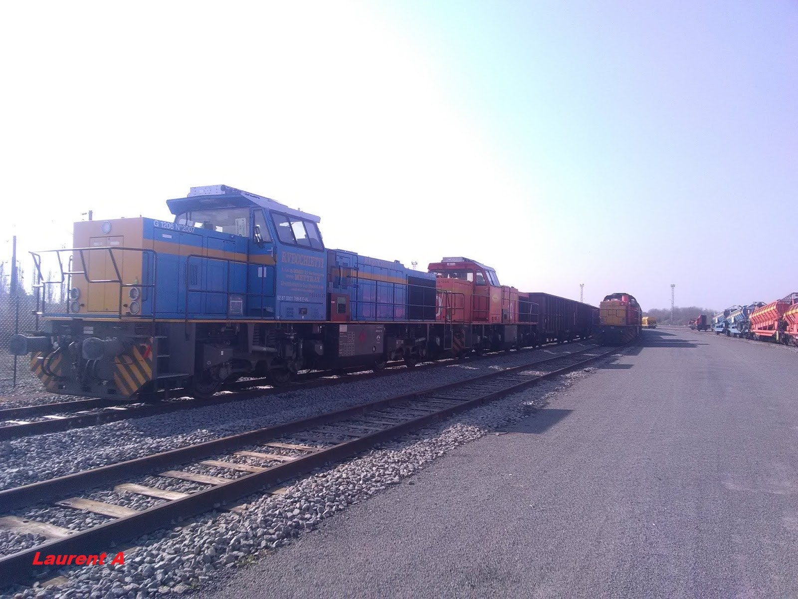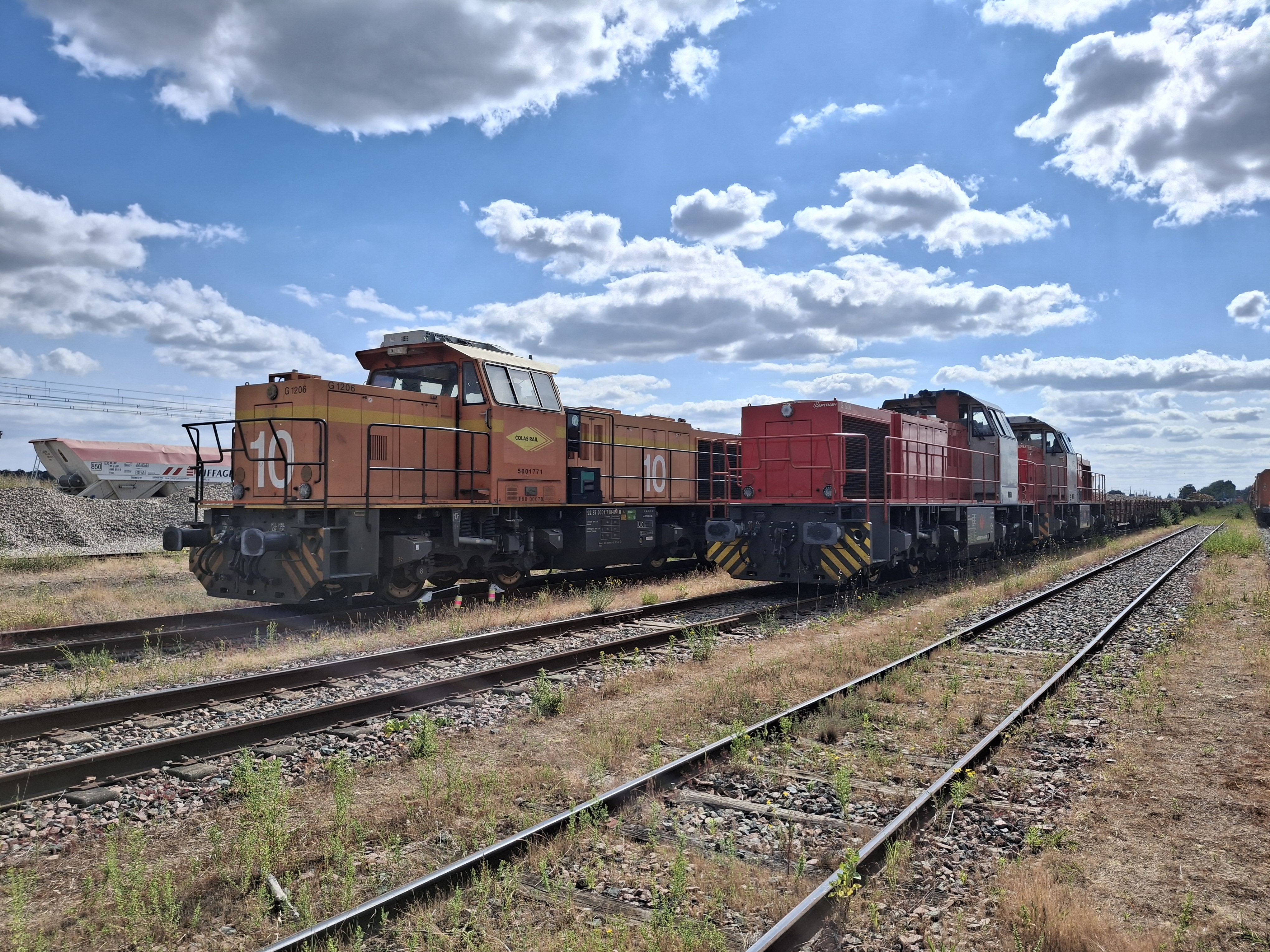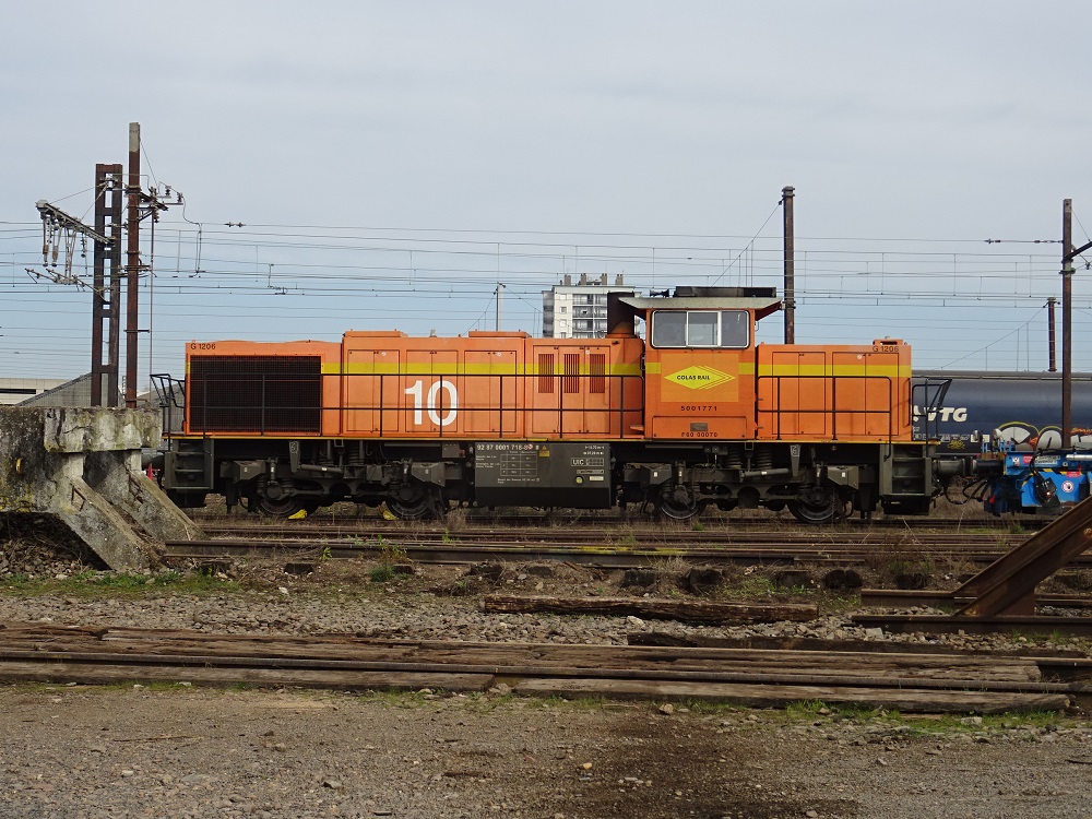 Voici la Mak G 1206 BB 5001771 Colas Rail 10 (25-03-2007) en tête avec la G 1206 BB 5001773 Colas Rail 12 sur une rame de tombereaux F28 pour une base de travaux de la LGV SEA