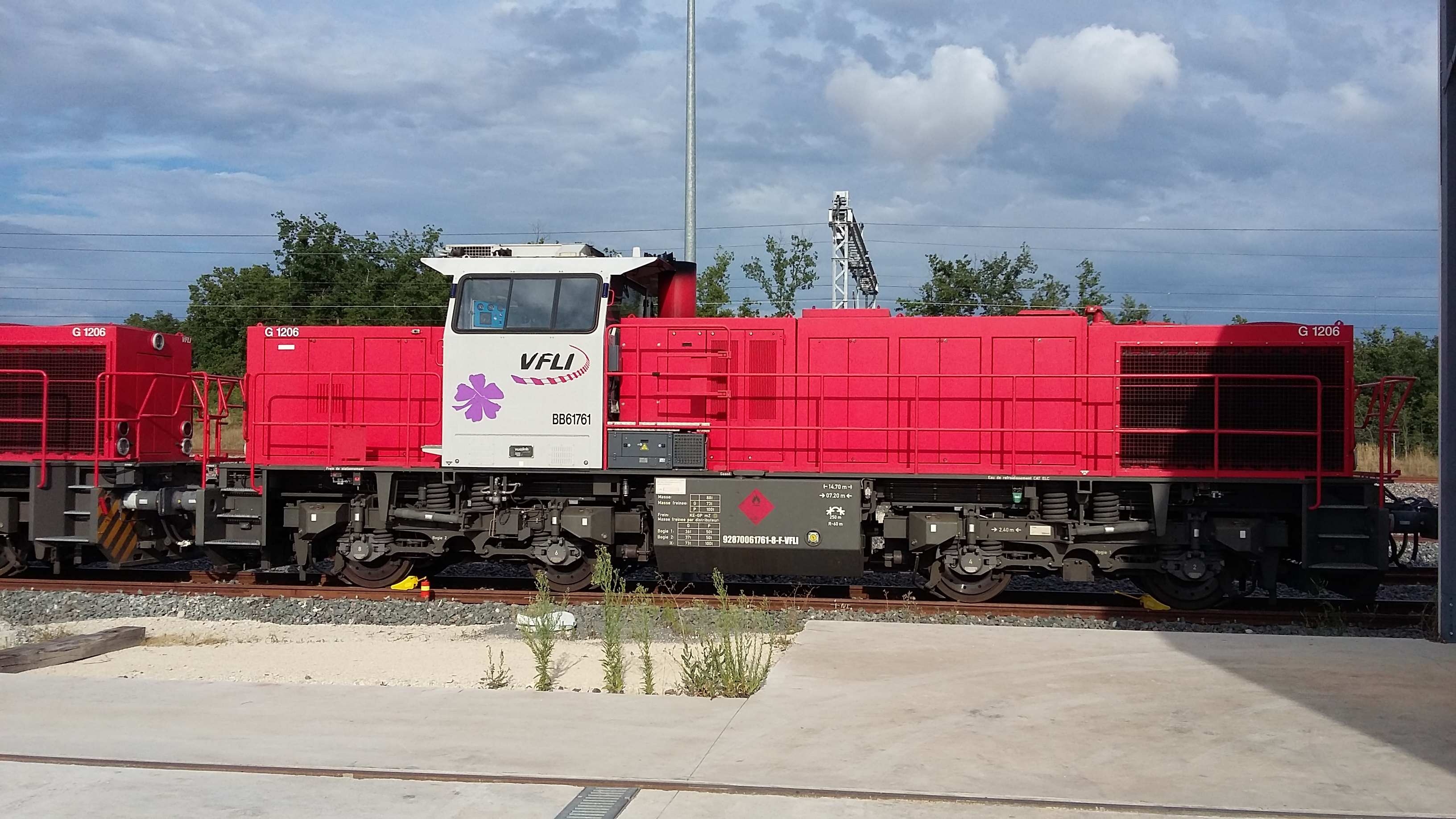 Voici une photo prise lundi de la machine sur la base de maintenance MESEA de Villognon (16). La machine est en UM avec une autre G1206 VFLI 92 87 0061 763-4, en configuration UM pour assurer le secours des TGV. (cf. post de la 763-4 pour plus de renseignements).