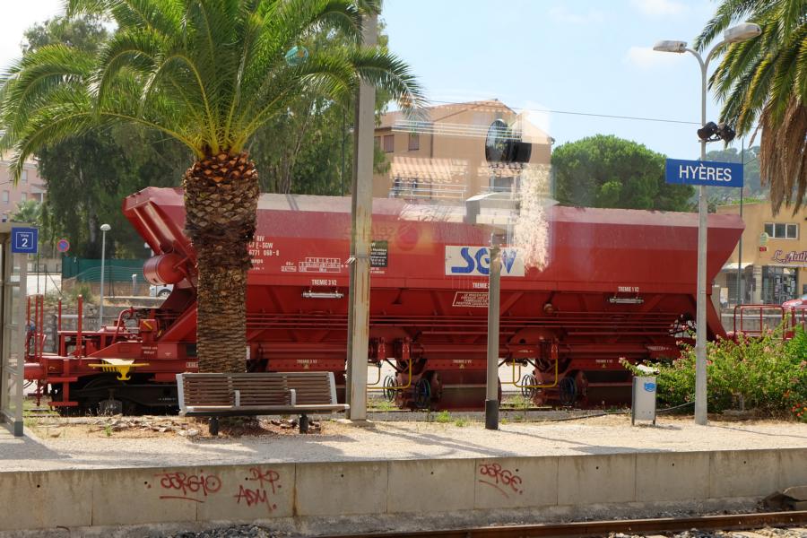 Wagon trémie présent en gare de Hyères le 9 septembre 2014 dans une rame de 10 wagons. Désolé pour la qualité de la photo, la partie de la rame côté Toulon n'était pas très bien accessible.
