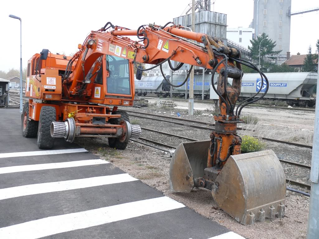 Voici une pelle Colas Rail en gare de Nangis. Elle intervient en ce moment au PN et en gare pour changer la voie, dans le cadre du RVB de Gretz à Romilly sur Seine.