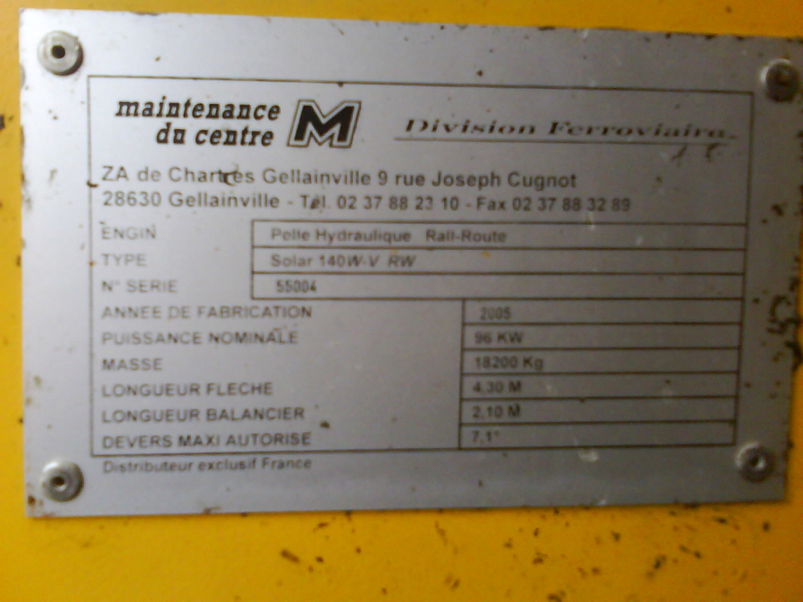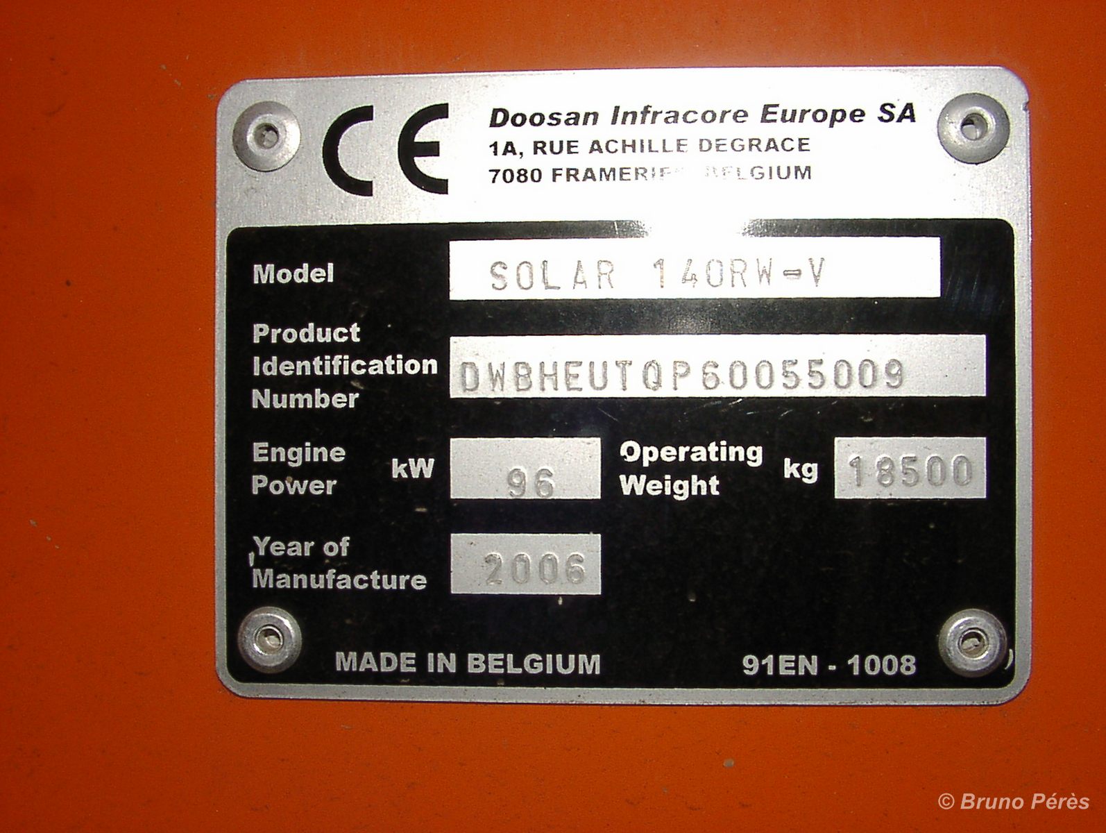 Je pense que tu peux rajouter à ta liste la plaque constructeur de cette pelle :mrgreen: car, sauf erreur de ma part, la plaque en photo n'est pas la bonne. Voici un plaque constructeur de Doosan (ici, une 140 WV-RW d'ESAF) :