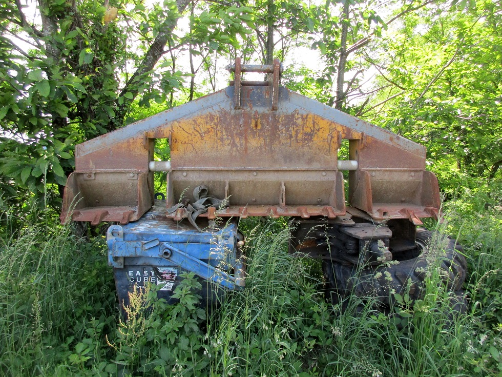 Un peu à l'écart sur le talus, divers accessoires (pneus, caisson d'outillage divers, godet preneur + godet multifonction "Mourgeon") :