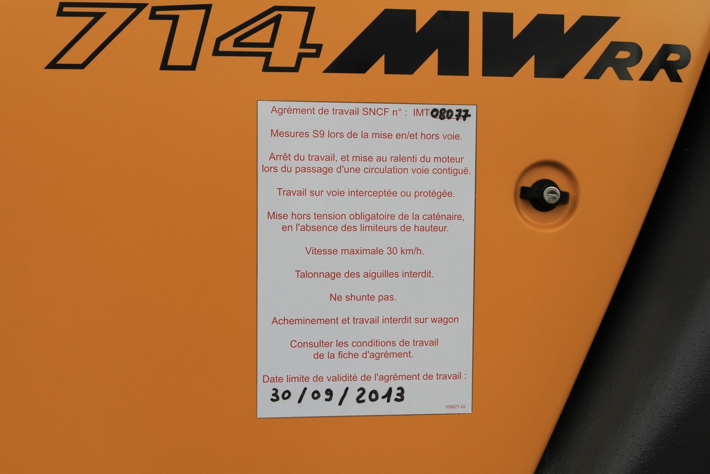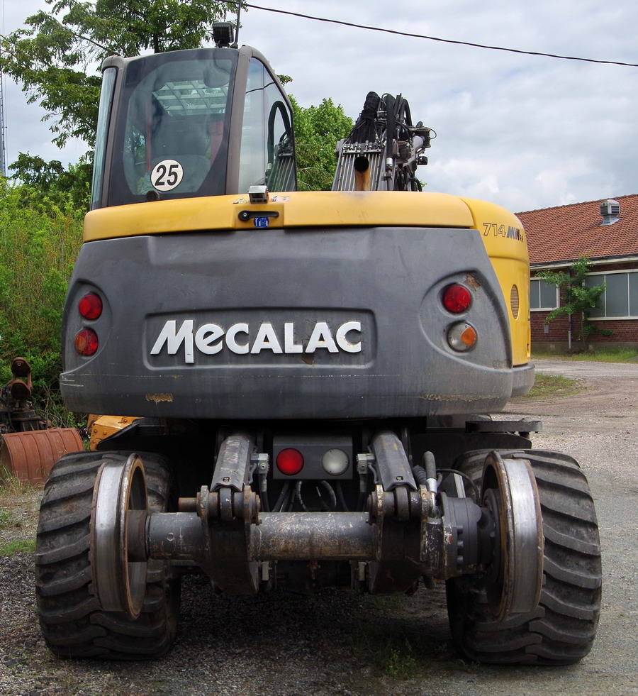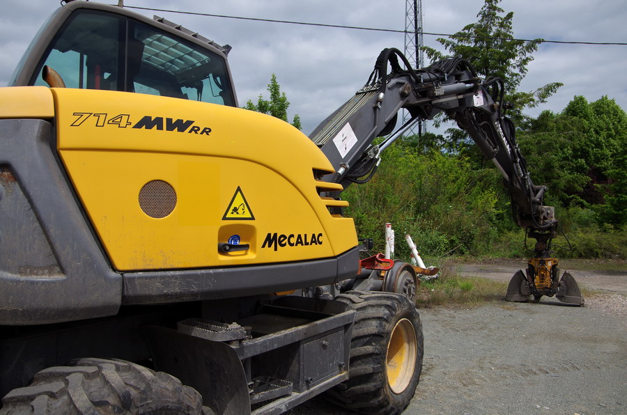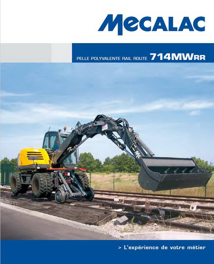 https://www.mecalac.com/fr/machine/714mwrr.htmlIssue du modèle routier dont elle a pris tous les avantages, la machine 714MW Rail Route s'adapte aux attentes de compacité et de performances des chantiers ferroviaires. Avec un rayon de giration arrière de 1565 mm, la 714 MW RR travaille sur une seule voie de circulation. De plus, la cinématique de son équipement lui permet de s’adapter au chantier, même dans les espaces les plus restreints. Efficacité de la cinématique, attache rapide, compacité, donnent à la 714MW RR une flexibilité à toute épreuve, parce que vos chantiers exigent de plus en plus de rentabilité.