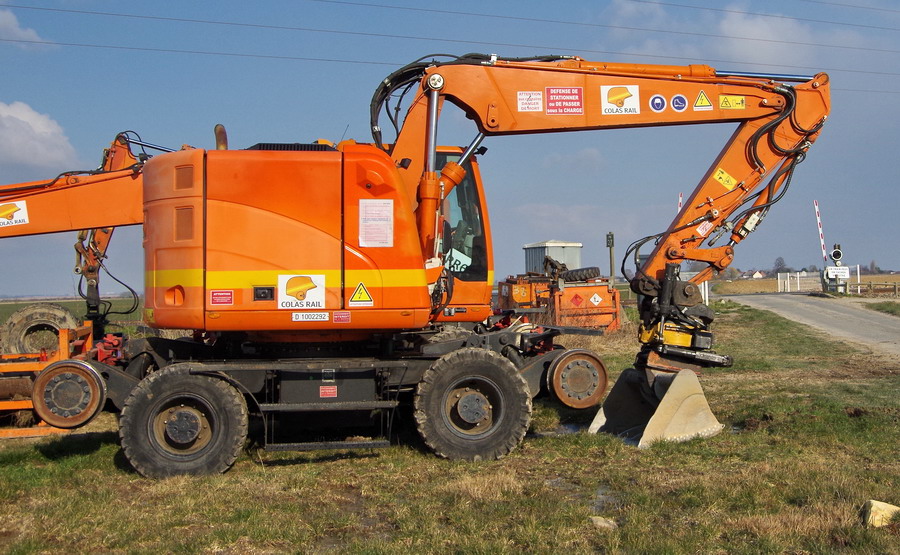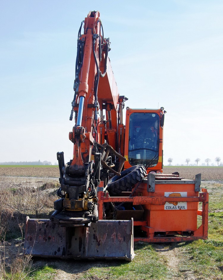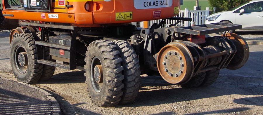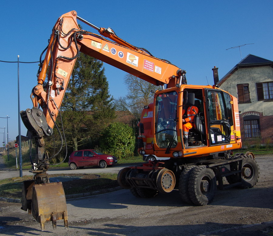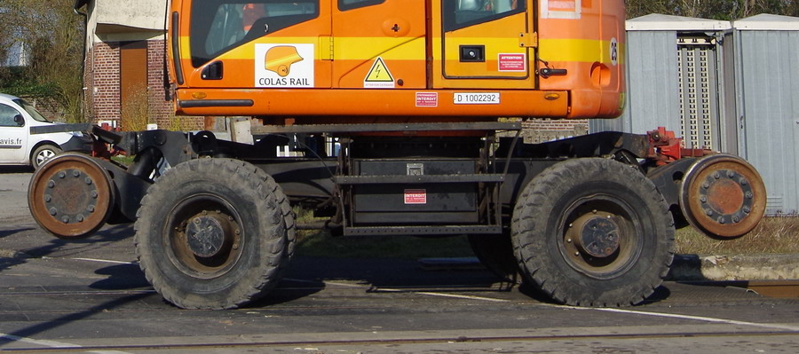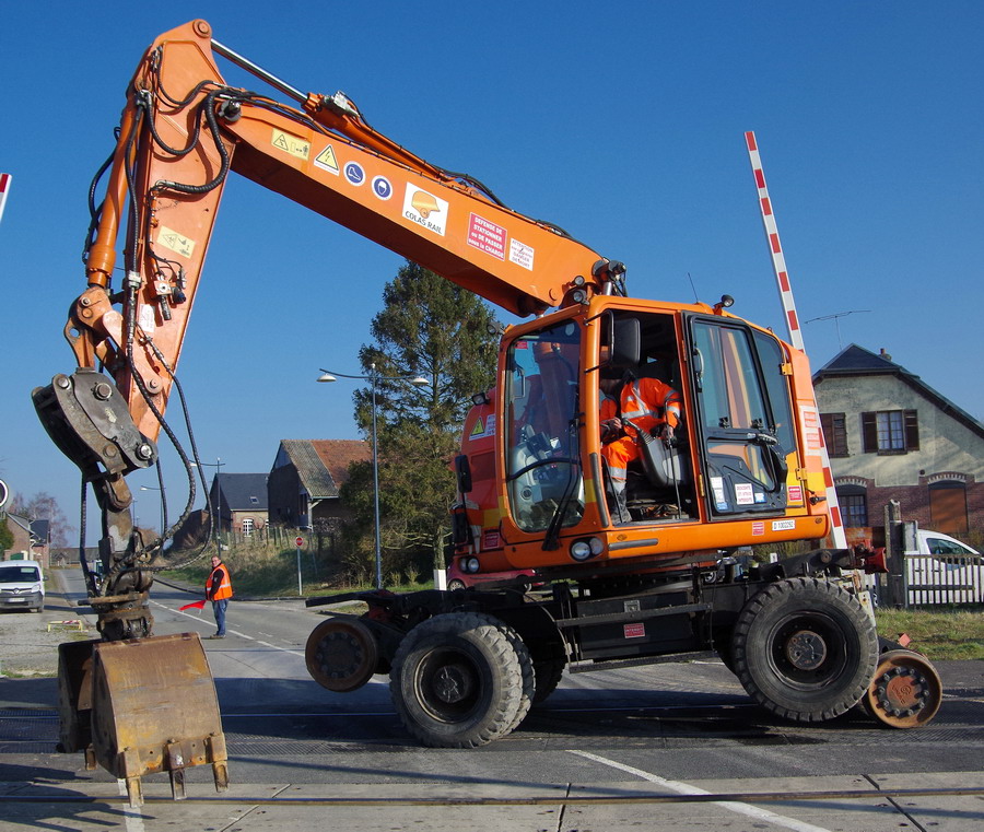 la Pelle Rail-route va se mettre sur les rails elle profite du passage a niveau pour se mettre sur les rail puis elle part sur la zone de chantier