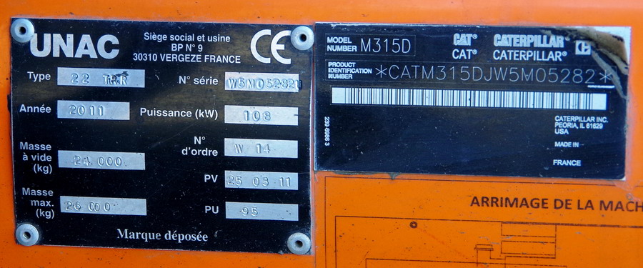 Pelle Rail route 22TRR n°CATM315DJW5M05282 de 2011 n° d'ordre W14 - PV 25-03-2011 pour Colas Rail D100 2292