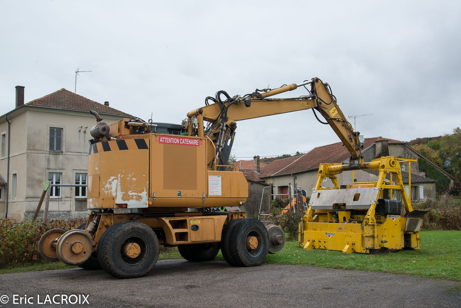 PRR CASE WX170 D2R de l’entreprise Fornoni équipée d'une balayeuse à ballast RABAUD à Tilleux (88) en octobre 2016.