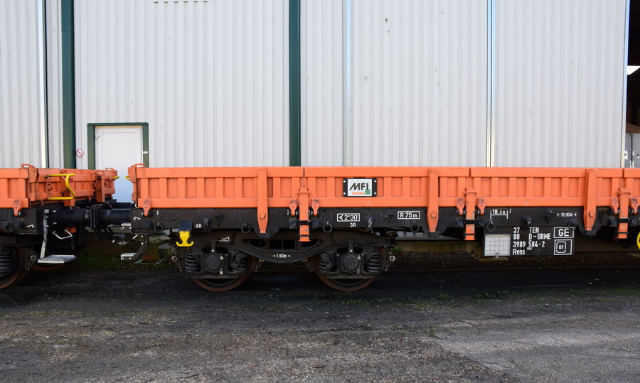 Voici le wagon 37 80 3989 584-2 Rens 192 C - TEN RIV D-ORME de la société On Rail Gmbh (Allemagne) pour la société de location de wagons M.F.I sa (Matériel Ferroviaire et Industriel) de Strasbourg qui est une société spécialisée dans l'achat-vente, la location,