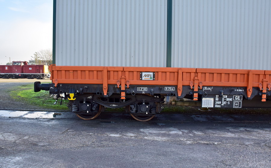Voici le wagon 37 80 3989 587-5 Rens 192 C - TEN RIV D-ORME de la société On Rail Gmbh (Allemagne) pour la société de location de wagons M.F.I sa (Matériel Ferroviaire et Industriel) de Strasbourg qui est une société spécialisée dans l'achat-vente, la location,