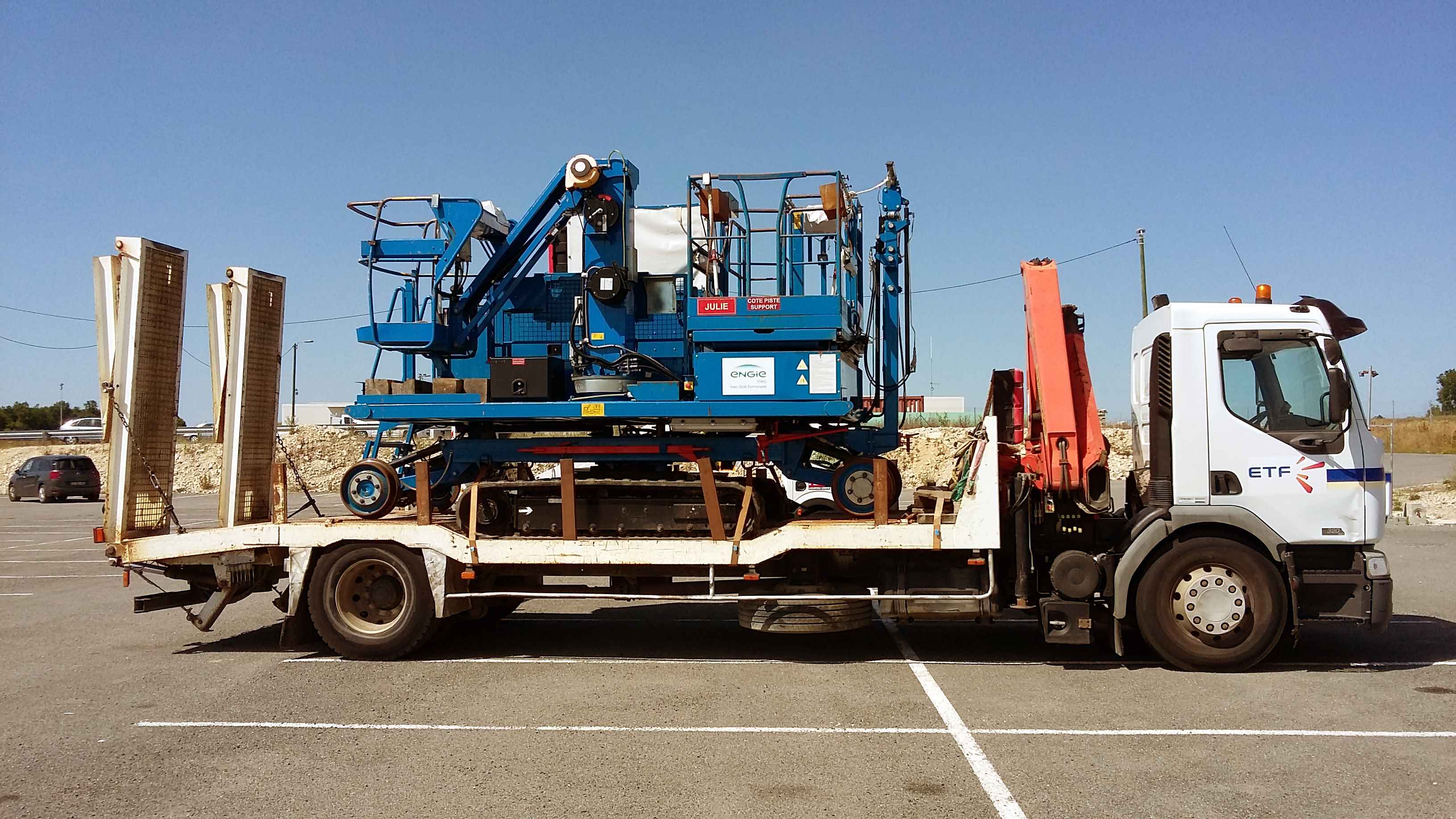 Voici un ELAN OOC non identifié d'Engie (Ineo Sclé Ferroviaire) aperçu en stand by sur un porteur ETF en juin 2017 sur la base travaux de Villognon. Ce qui est certain c'est qu'il s'appelle "Julie" et que le bleu lui va bien.