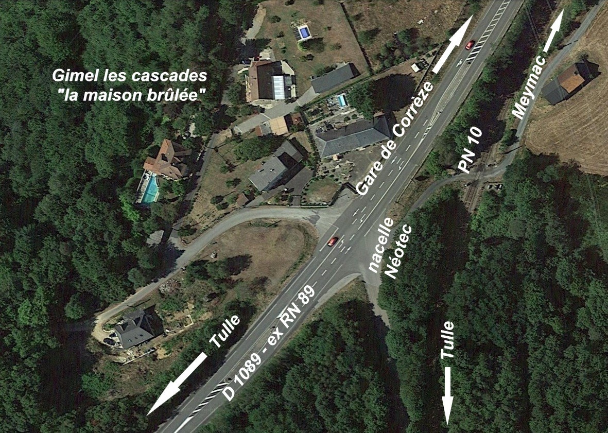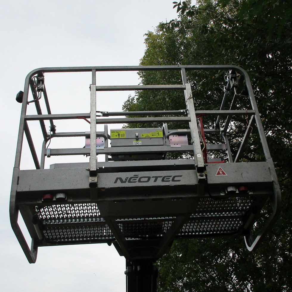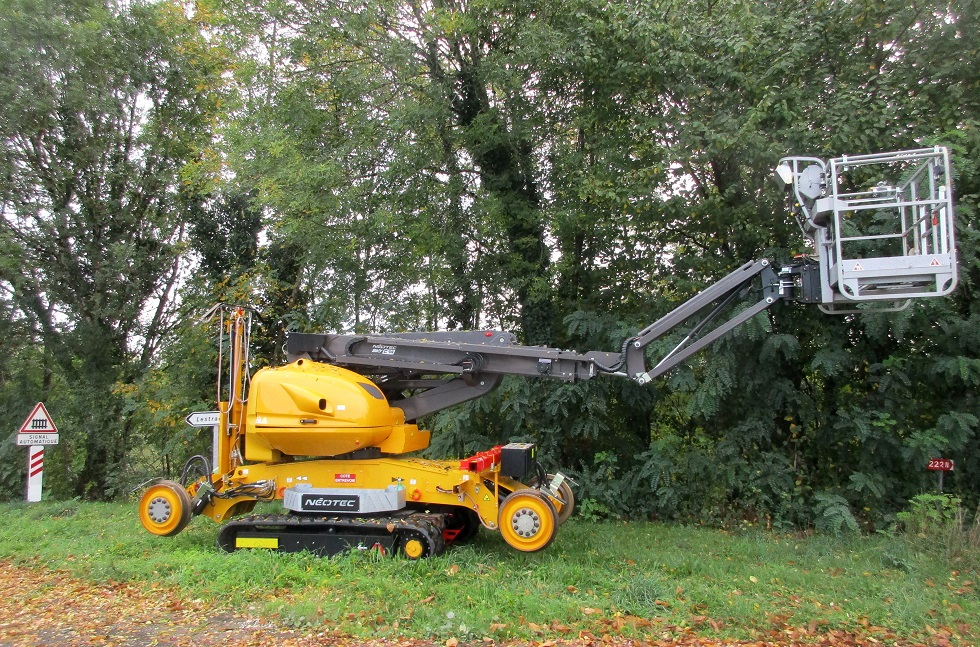 Une nacelle SKY400C Néotec au lieu-dit "la maison brûlée" sur la commune de Gimel les cascades (Corrèze) en bordure de la D 1089 (ex RN 89 Bordeaux - Clermont Ferrand), à proximité du PN 10 sur la ligne à voie unique non électrifiée de Tulle à Meymac :