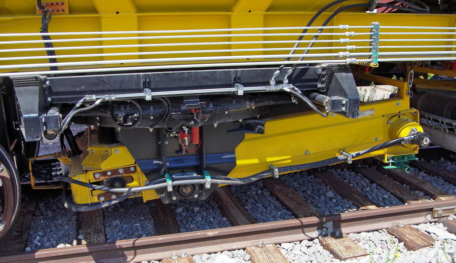 avec deux trémies et possibilité de ballastage, et aussi pour récupérer l'ancien ballast et qui le vide avec les bandes transporteuses