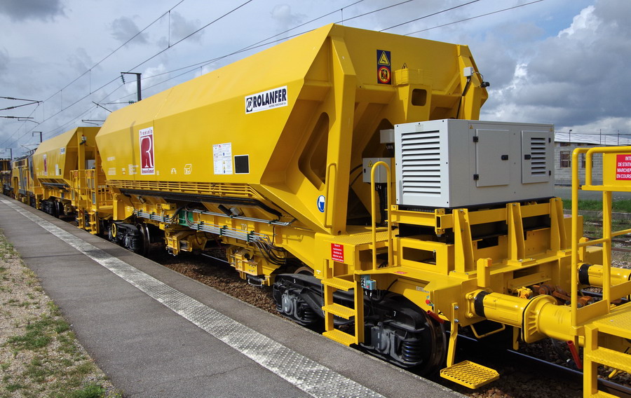 avec deux trémies et possibilité de ballastage, et aussi pour récupérer l'ancien ballast et qui le vide avec les bandes transporteuses