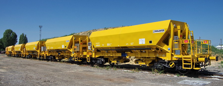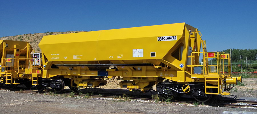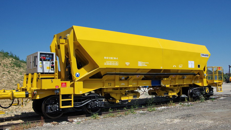 avec deux trémies et possibilité de ballastage, et aussi pour récupérer l'ancien ballast et qui le vide avec les bandes transporteuses