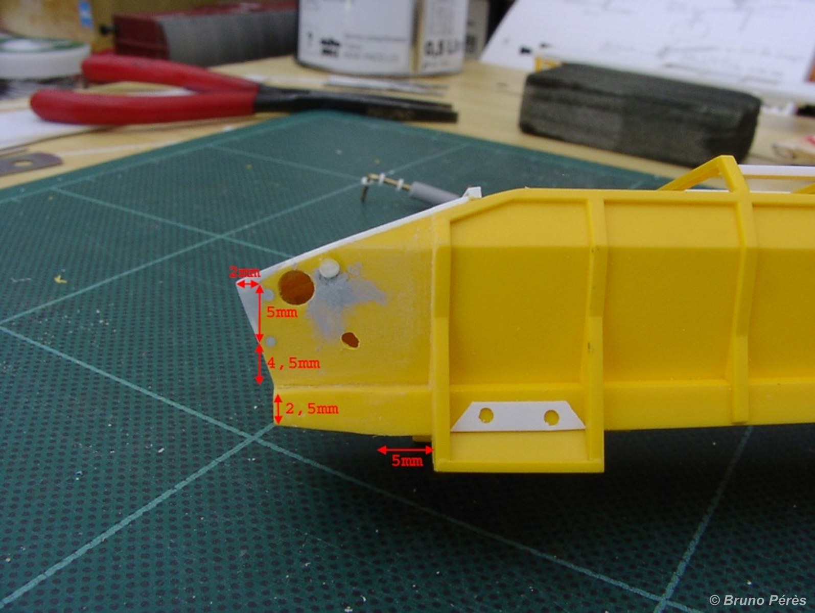 Reprofilez l'arrière de la trémie. Pour cela, collez un profilé EVG de 2mm x 0,7mm que vous mettrez en forme en respectant les cotes ci-dessous une fois l'assemblage bien sec (une journée de séchage). Poncez également la trémie pour obtenir une oblique bien rectiligne avec le profilé EVG ajouté.