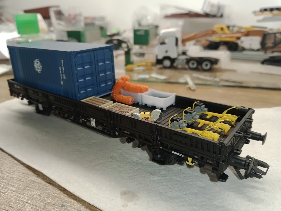 wagon plat K50 TSO avec conteneur et diverses pièces en stock