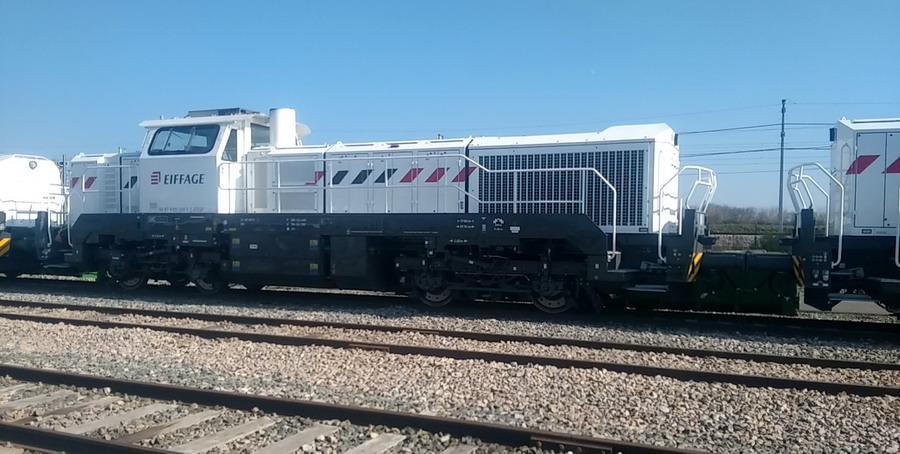 avec les cinq DE 18 5502221/5502222/5502223/55056 et 5505557 déjà arrivées sur le site, avec mise en place des logos EIFFAGE sur les cabines